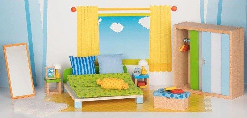 Sypialnia Uni Goki to prosta, ale i przyjemna dla oka kompozycja obejmująca drewniane mebelki dla lalek wyposażone we wszystkie detale pozwalające utrzymać realizm i wyposażyć dziewczęcą willę w konieczne udogodnienia.