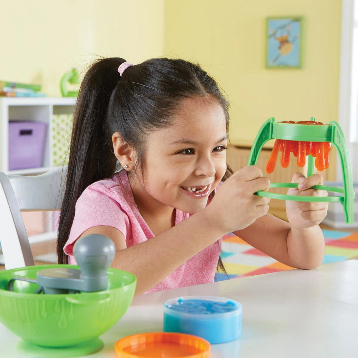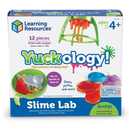 Zestaw narzędzi do tworzenia własnych mas plastycznych - Slime Lab od Learning Resources. Używając składników, które są łatwo dostępne, dzieci rozwijają swoje podstawowe umiejętności naukowe łącząc, mieszając oraz rozciągając swoje własne masy plastyczne. Uczą się miar, czytania przepisów, łączenia barw i wiele innych podążając za łatwą instrukcją.