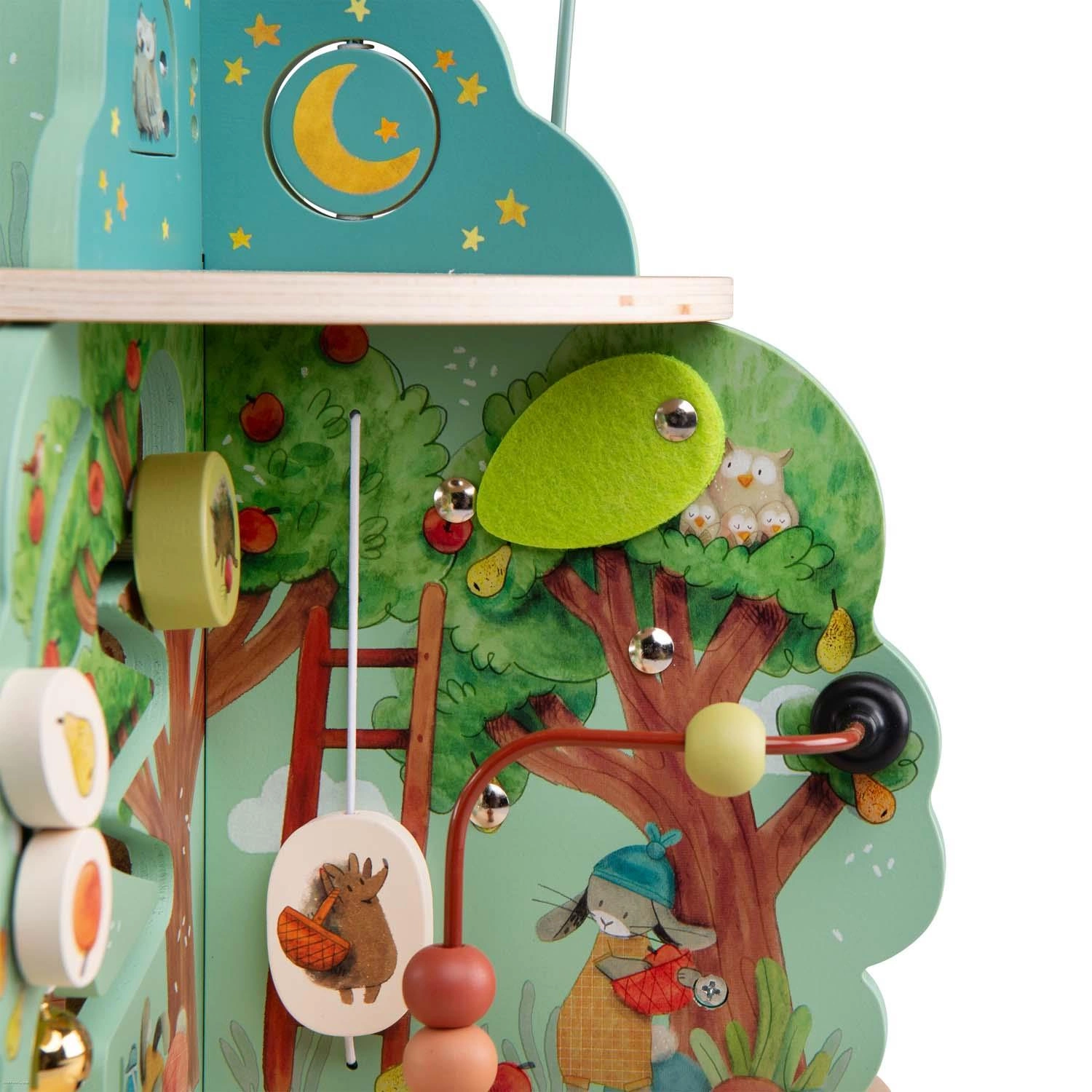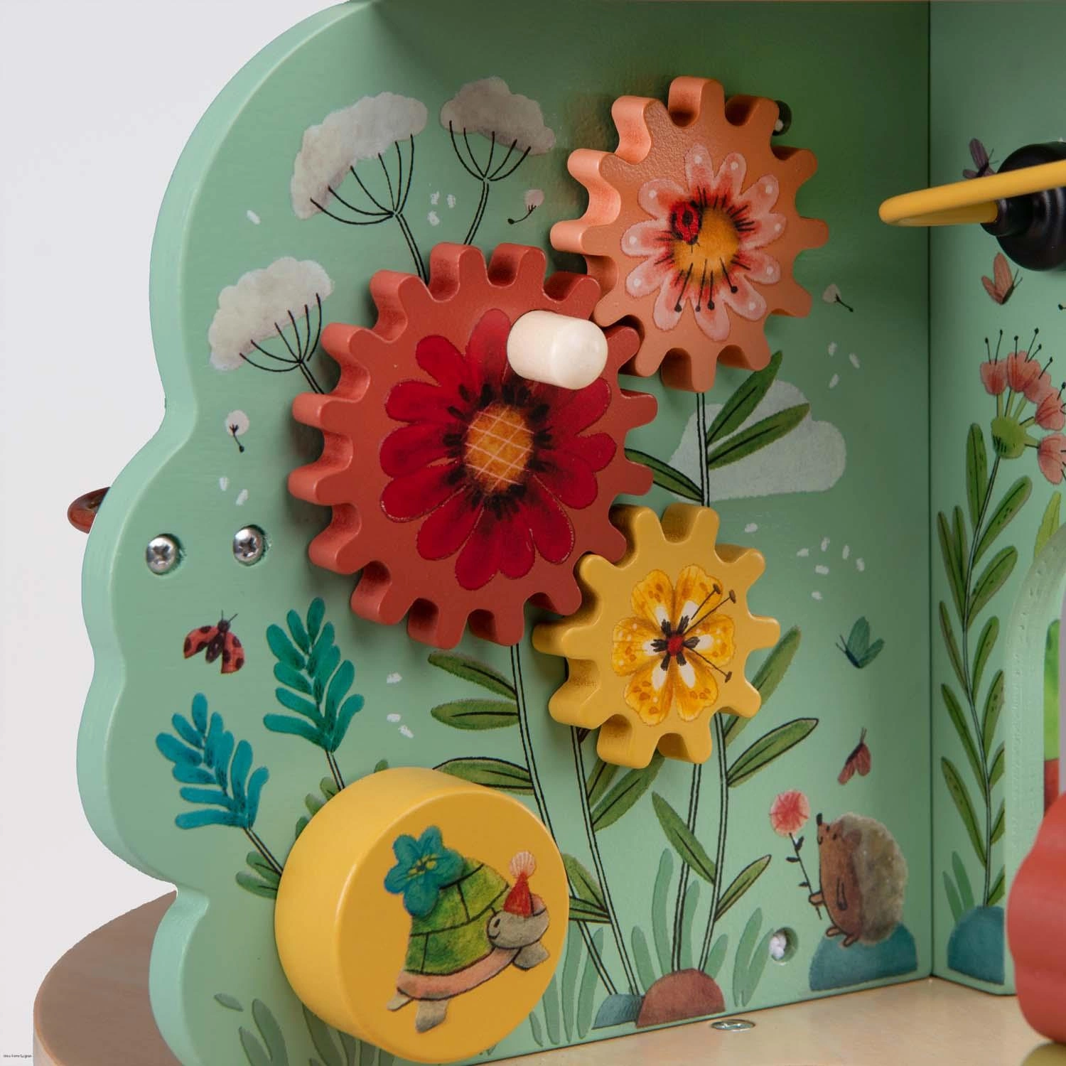 Drewniana zabawka aktywizująca jest dedykowana dzieciom powyżej 1. roku życia. Ogród umiejscowiony na podstawce skrywa wiele tajemnic do odkrycia. Podzielony jest na różne strefy: pod ziemią, w sadzie, nocą. Wszystkie części są bogato ilustrowane. Maluszki mogą manipulować ruchomymi elementami oraz dotykać różnych struktur i materiałów.