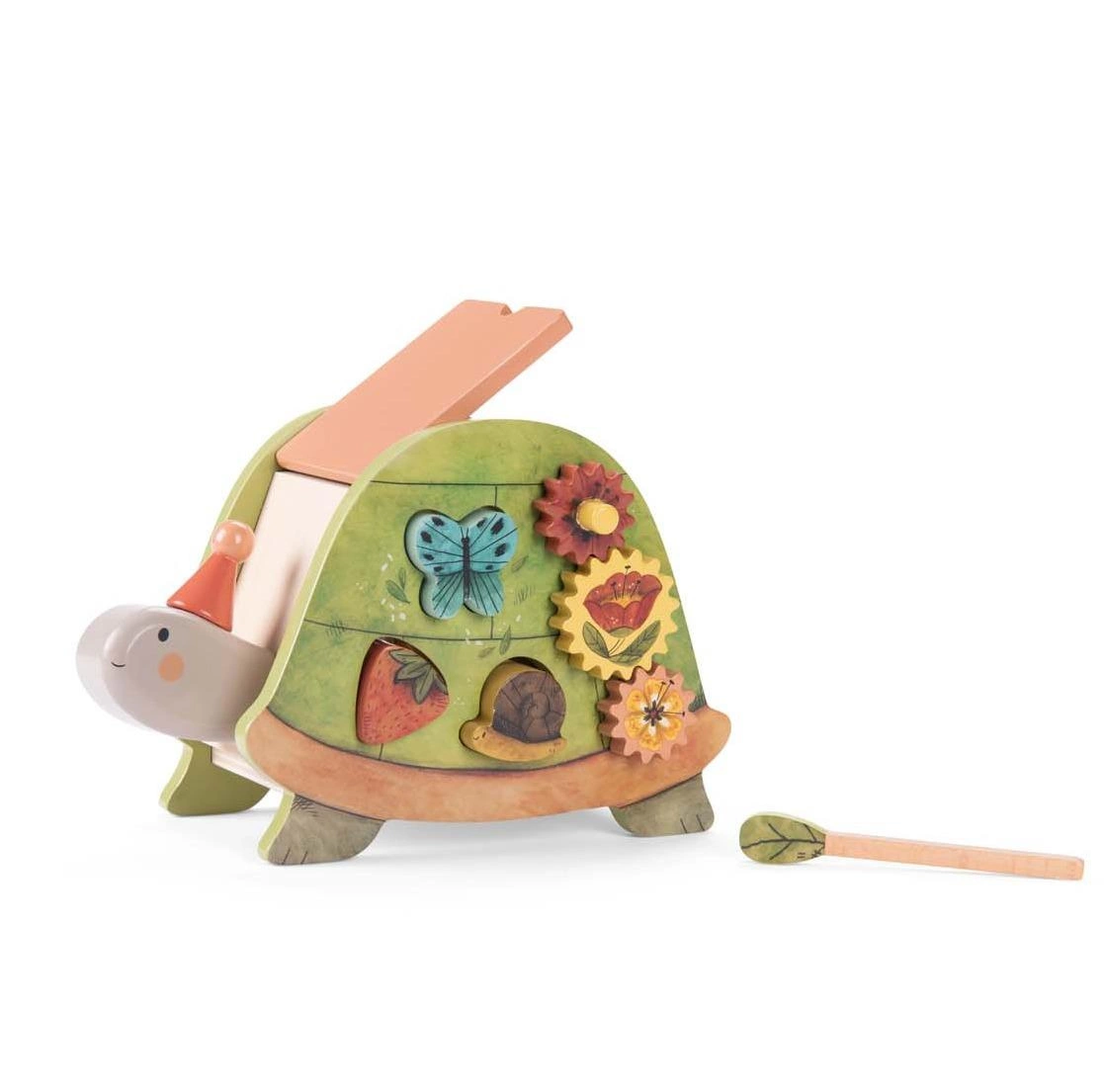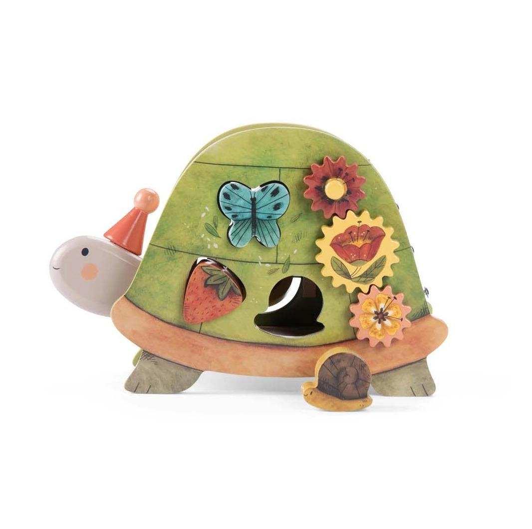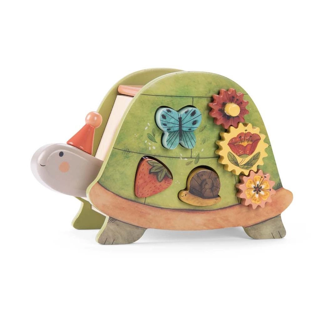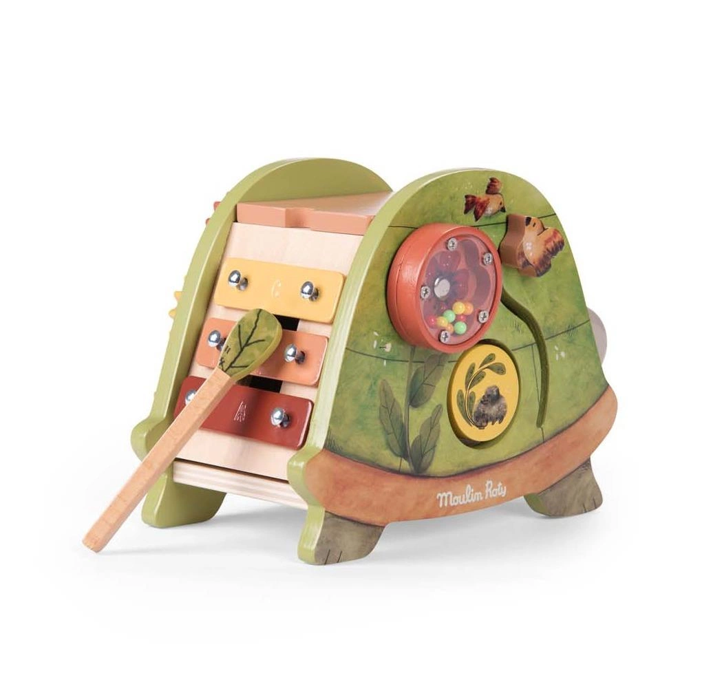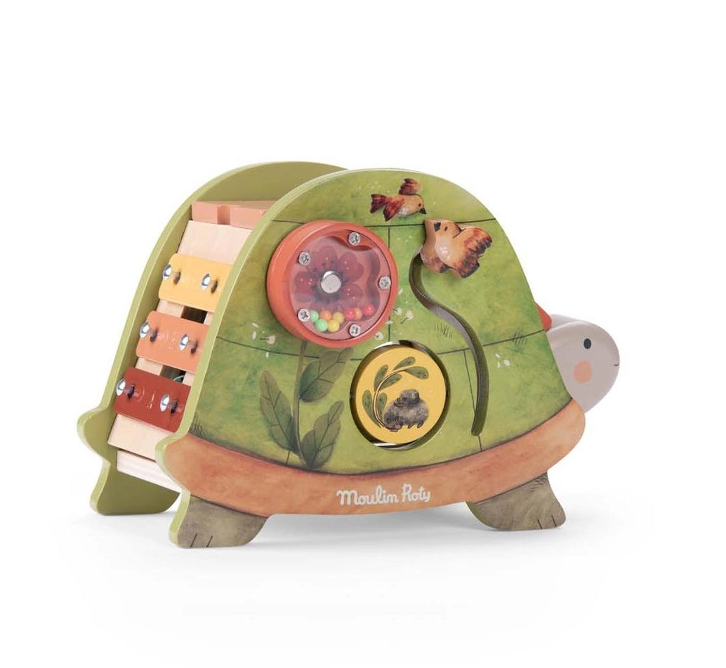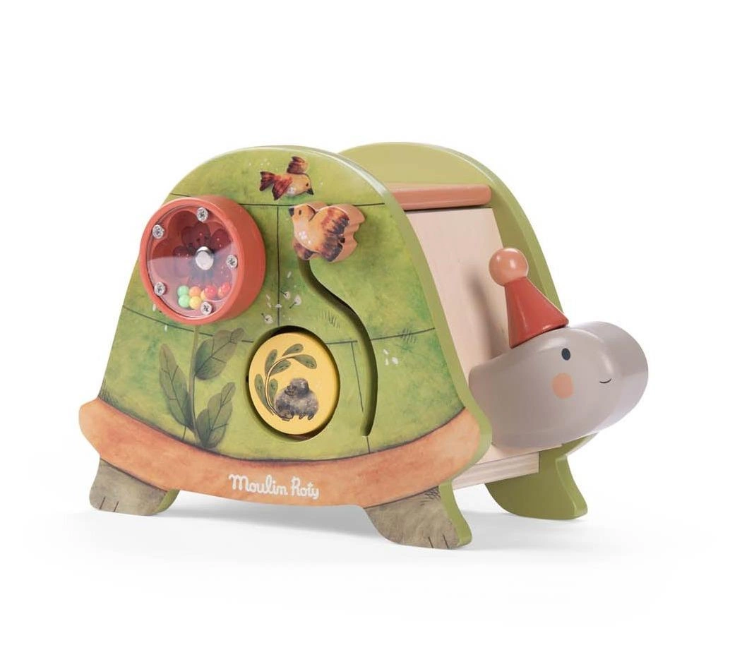Zabawka aktywizująca z kolekcji Trzy Małe Króliczki. Drewniany żółw oferuje różne aktywności pobudzające ciekawość dziecka. Na skorupie znajdują się cymbałki (pałeczka w zestawie), sorter z drewnianym elementami o różnych kształtach, koła zębate i inne.