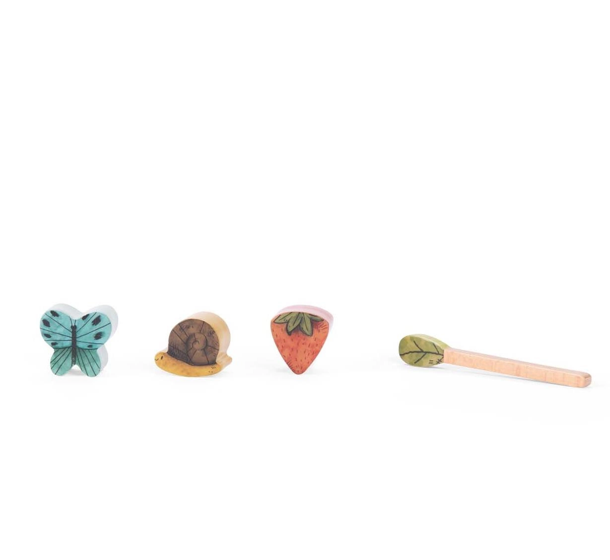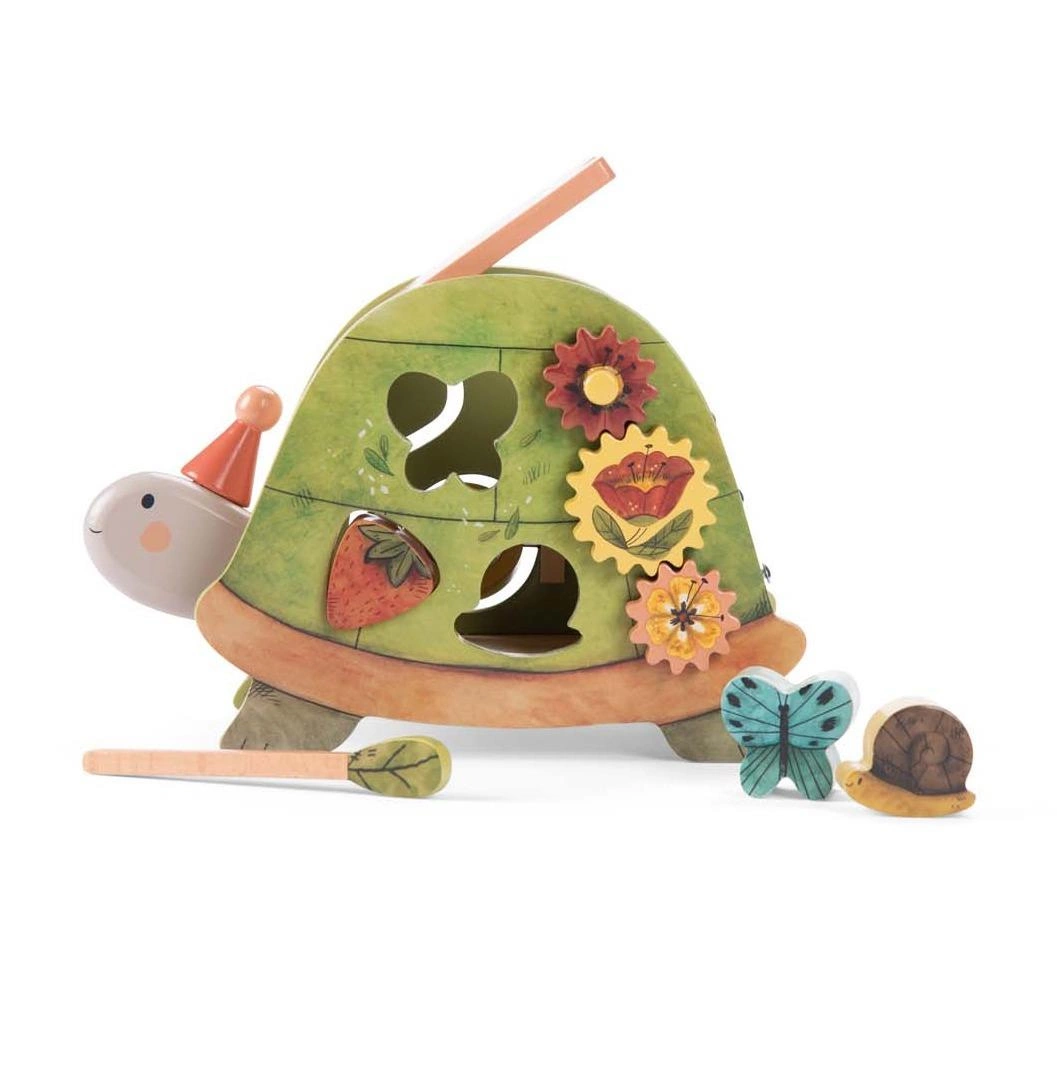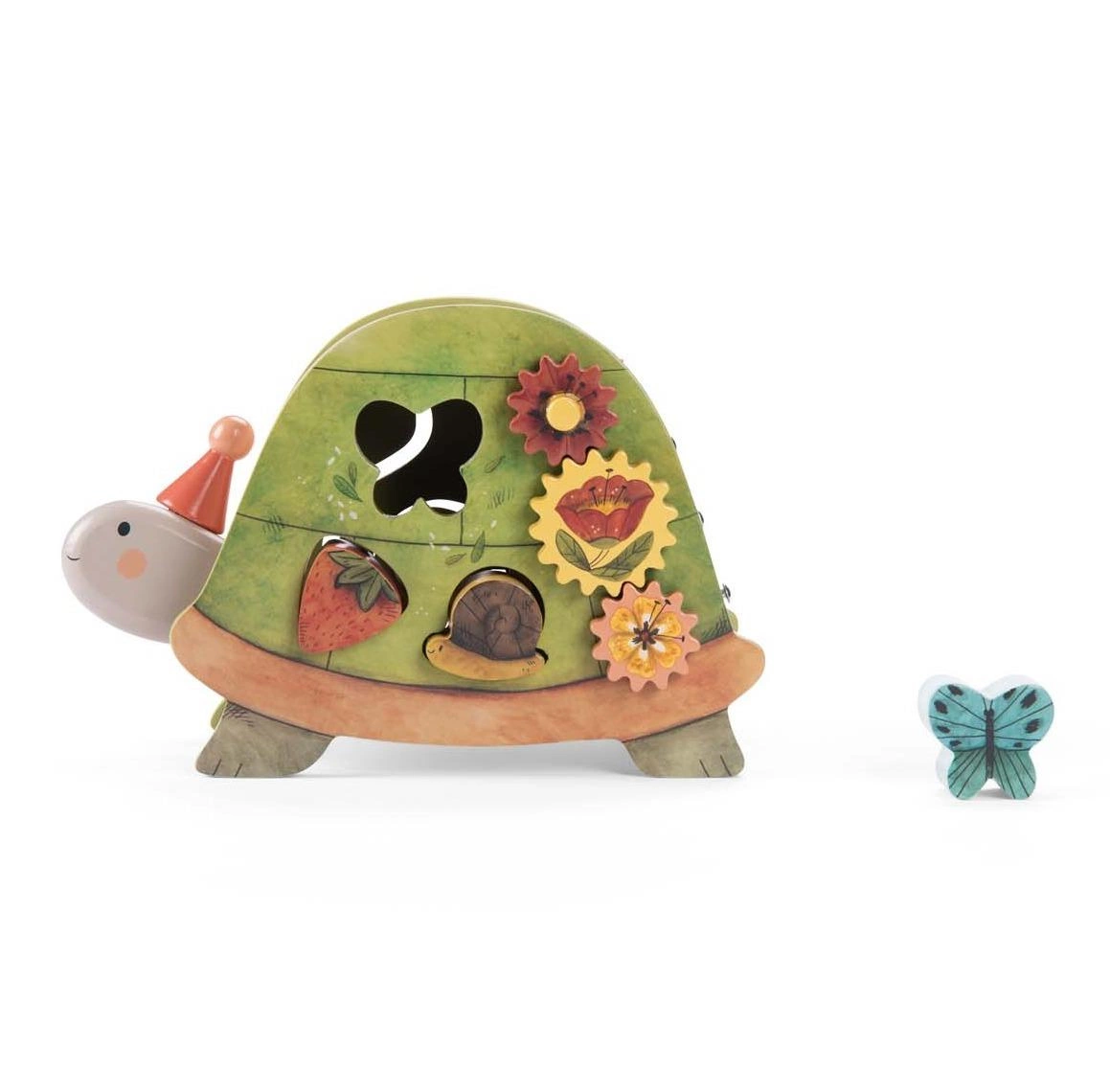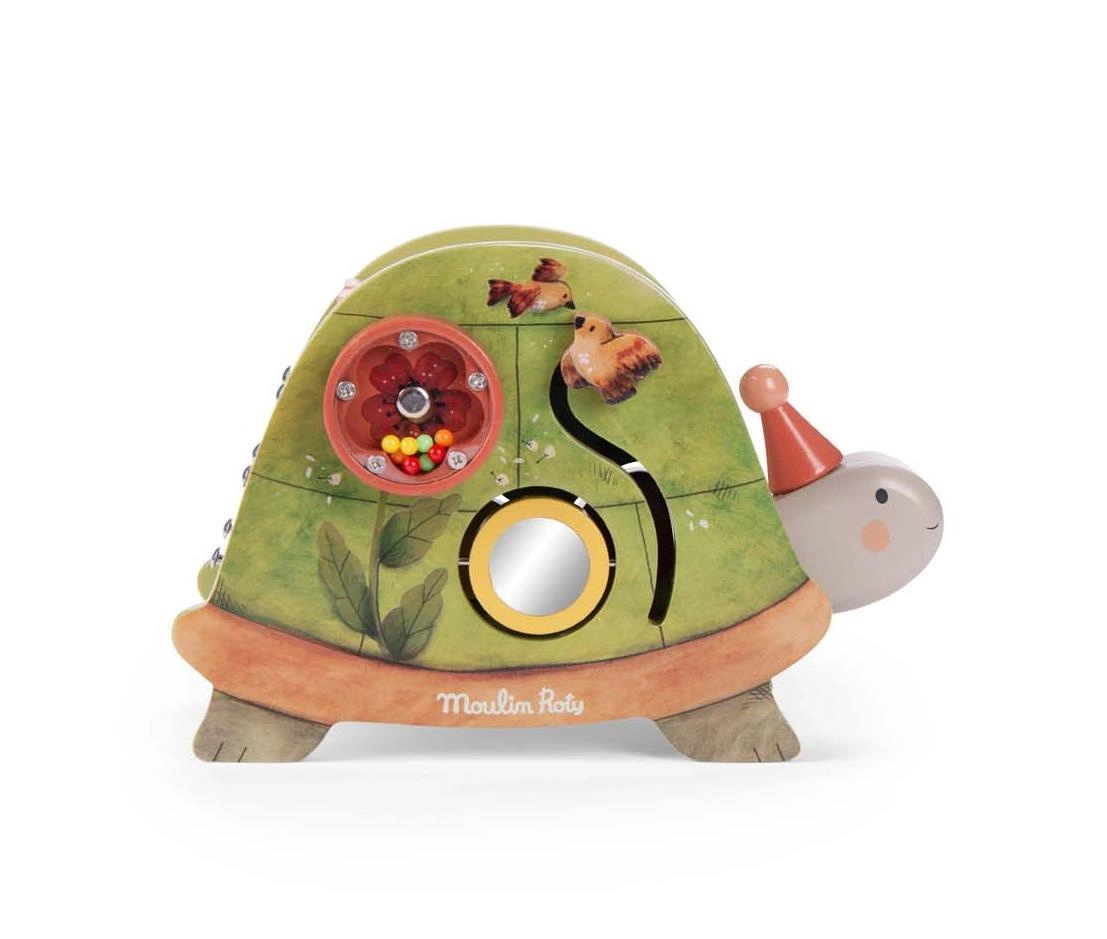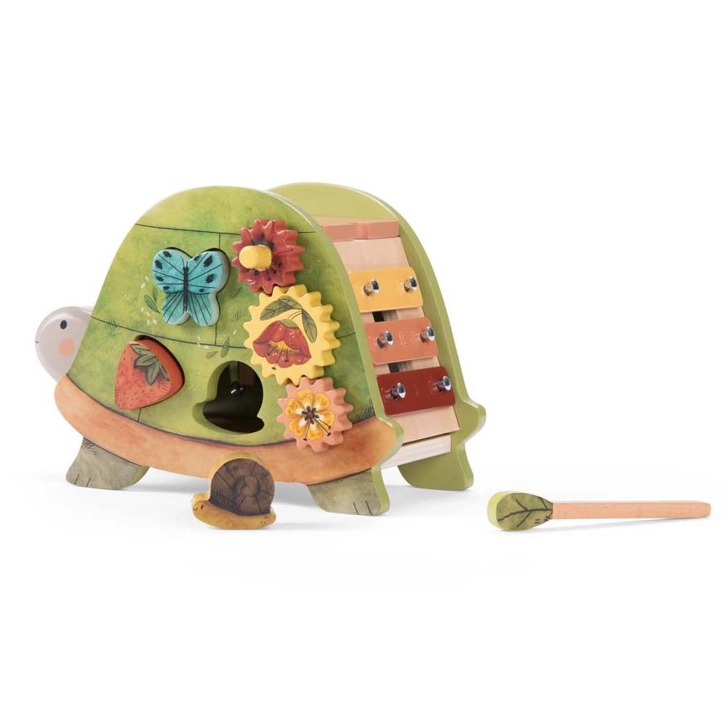 Zabawka aktywizująca z kolekcji Trzy Małe Króliczki. Drewniany żółw oferuje różne aktywności pobudzające ciekawość dziecka. Na skorupie znajdują się cymbałki (pałeczka w zestawie), sorter z drewnianym elementami o różnych kształtach, koła zębate i inne.