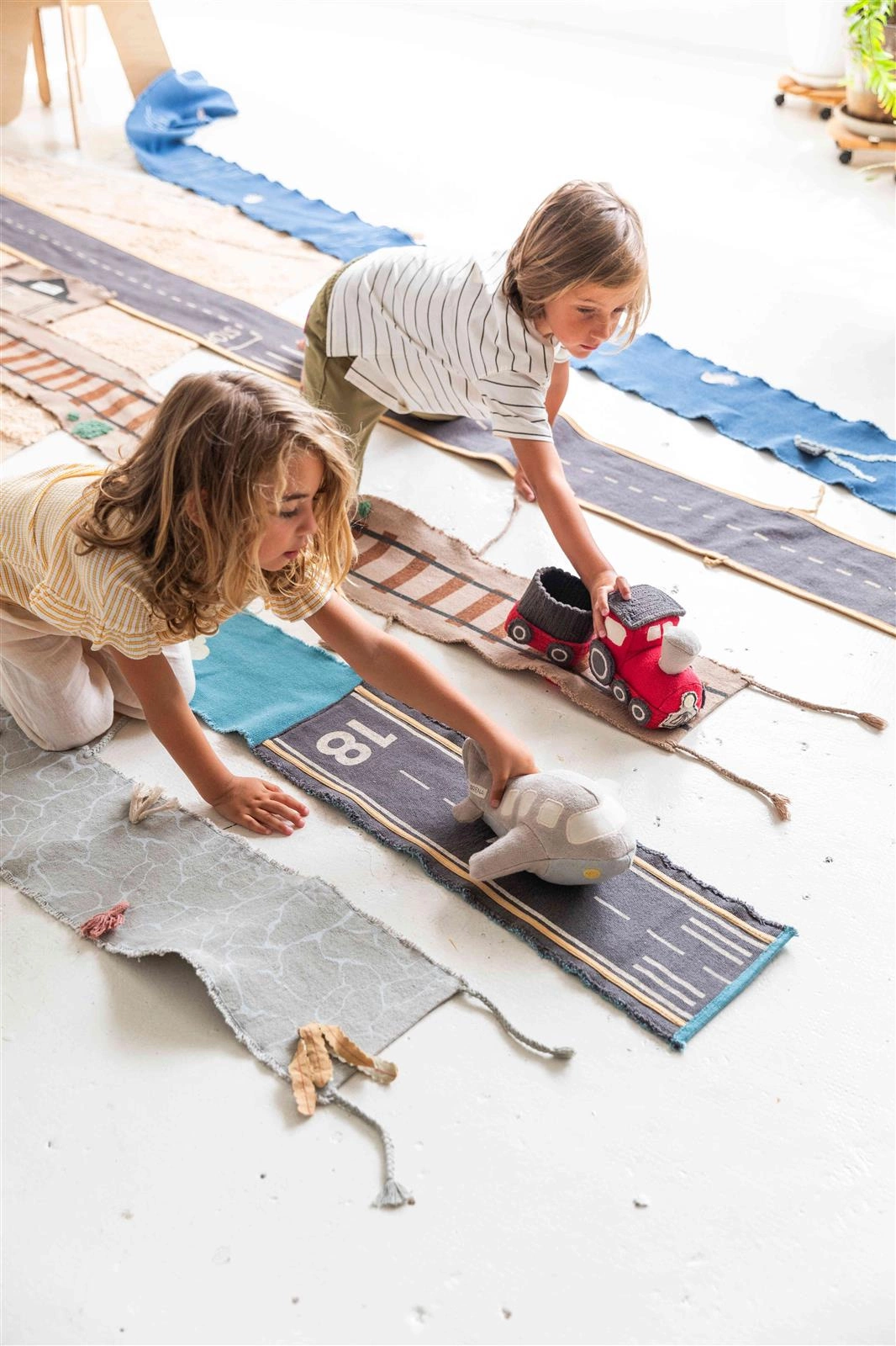 Ten wyjątkowy samolot typu Ride & Roll to wyjątkowa zabawka z długim pasem startowym, który pozwala na dalekie i ekscytujące loty! Jest on ręcznie wykonany z wykorzystaniem materiałów pochodzących z naszej własnej fabryki. Sam samolot jest miękki w dotyku i ma formę zwiniętą wokół 4-metrowego płóciennego pasa startowego o jasnoniebieskim kolorze. Na pasie tym znajdują się nadruki przedstawiające białe chmury i szare plamy, które przypominają lotniskowy pas startowy, idealny do startów i lądowań.