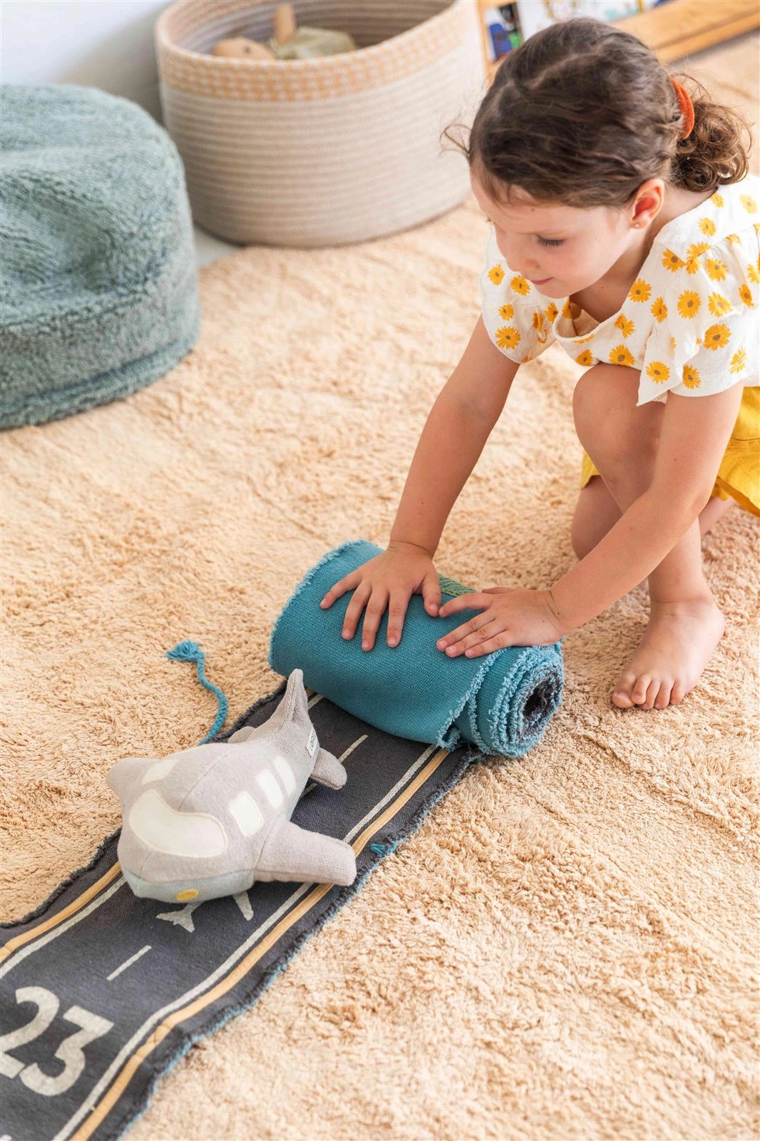 A co najważniejsze, dzięki plecionym sznurkom na brzegach pasa, można go łatwo zwinąć i związać razem z przyłączoną poduszką w kształcie samolotu. To sprawia, że ta zabawka staje się praktyczną teczką na przygody podczas podróży!