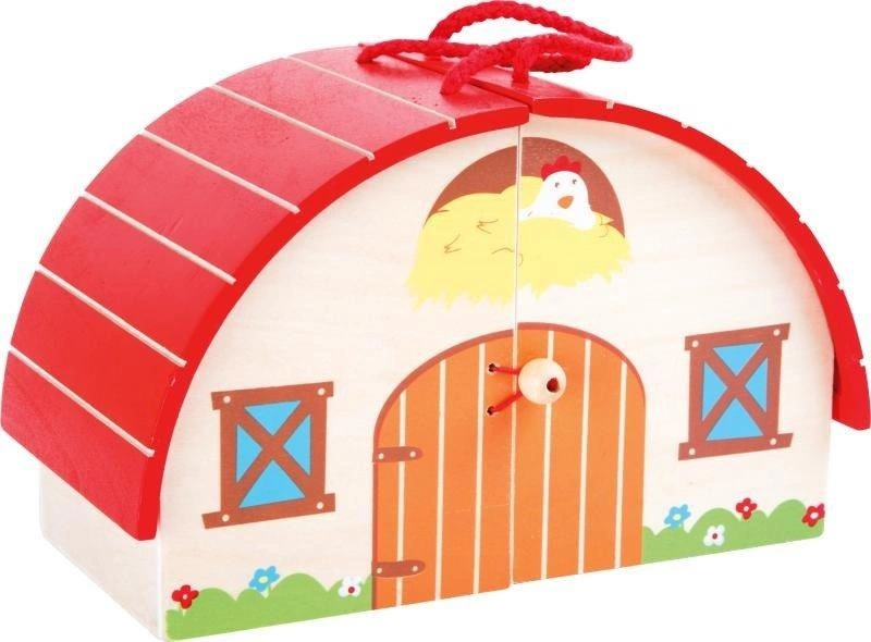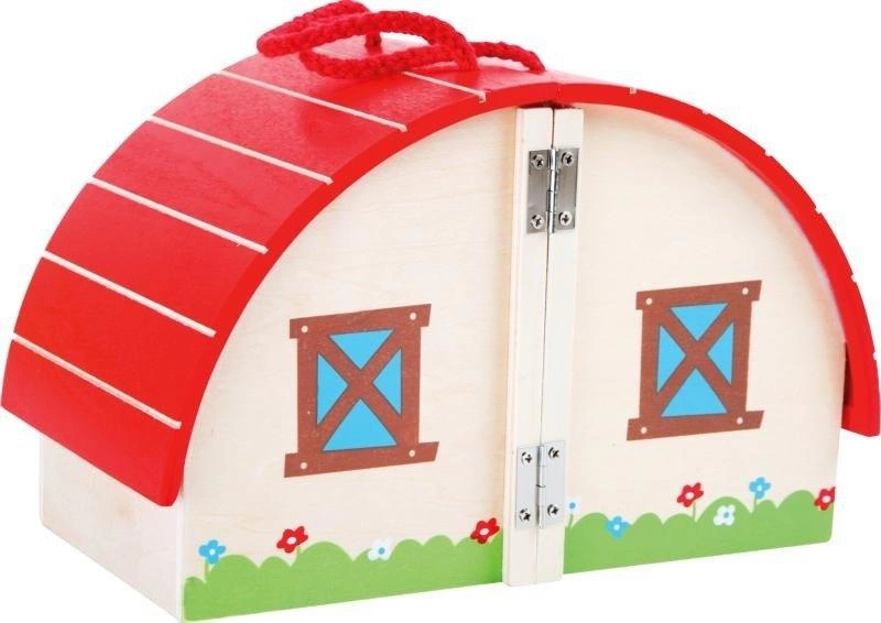 Zabawka dla dzieci Mała Farma Small Foot to zestaw drewnianych akcesoriów które razem tworzą obraz wiejskiej sielanki. Dzieci mogą bawić się poszczególnymi elementami odgrywając różnego rodzaju scenki. Wszystkie części kompletu mieszczą się w składanej szopie. Wystarczy odczepić gumkę i rozchylić obie części które utworzą pomieszczenie dla zwierząt a resztę dostępnych dekoracji można rozstawić wokół według uznania. Komplet jest wykonany z drewna oraz filcu.