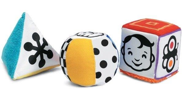 Miękkie zabawki dla niemowląt do zabawy i odkrywania nowych kształtów, wzorów, kolorów i faktur. Zestaw zawiera trzy figury: kostkę, piłeczkę oraz trójkąt. Każda z figur wykonana została w charakterystycznej dla serii Wimmer Ferguson kolorystyce czarno-białej stymulującej wzrok najmłodszych. Dodatkowo zabawki posiadają różne struktury pomagające w rozwoju sensorycznym wśród dzieci. Pośród zabawek wszyte zostały elementy takie jak: sztruks, plusz lub zamsz. Razem z dzieckiem baw się piłeczką lub kostką pomagając mu w prawidłowym rozwoju badawczo-poznawczym.