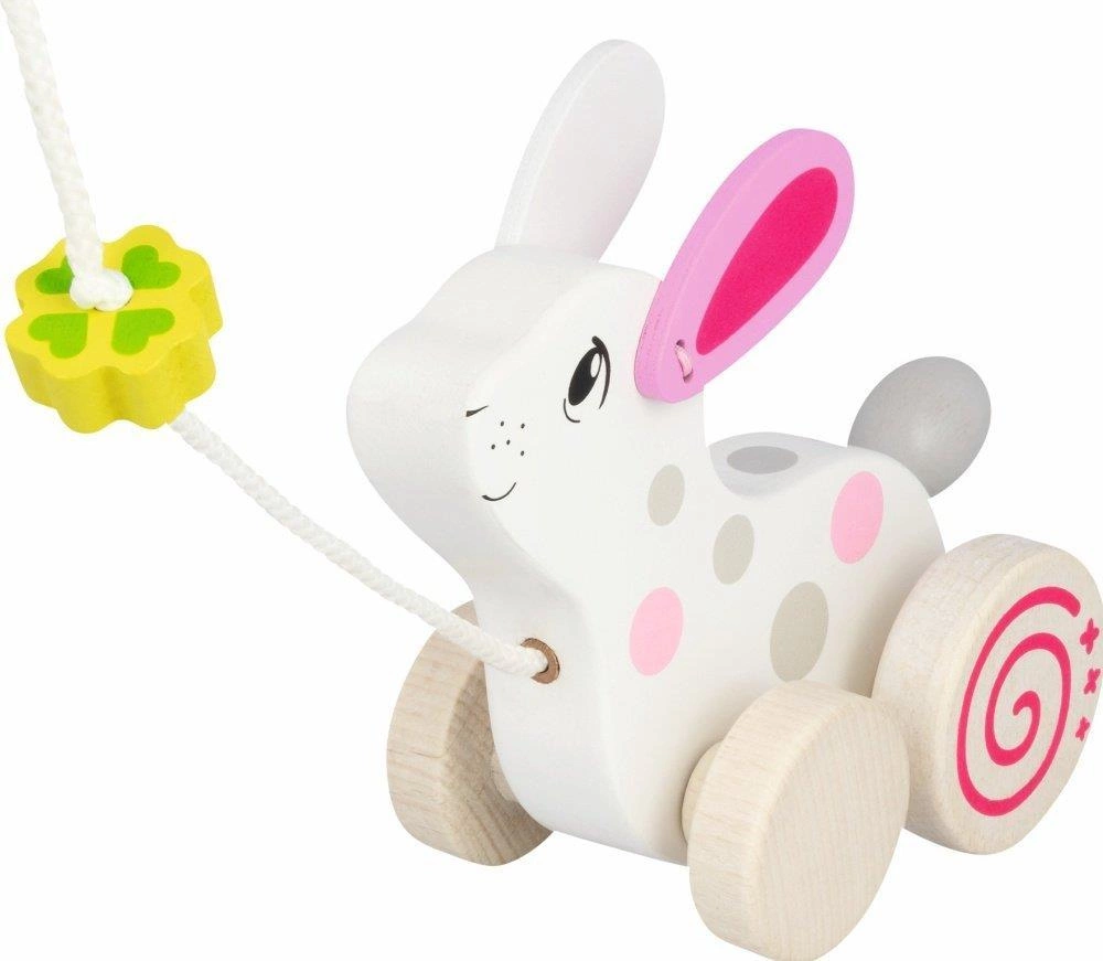 Drewniana zabawka do ciągnięcia, to prześliczna figurka króliczka, którą maluszek może się bawić na świeżym powietrzu jak i w zaciszu domowym. Po bokach zabawki umiejscowione zostały cztery drewniane kółeczka, które pozwalają swobodnie prowadzić zabaweczkę. Dodatkową atrakcją jest poruszający się w górę i w dół tył naszej zabawki w trakcie jej ciągnięcia. Ruchy zabawki imitują "kicanie" prawdziwego króliczka.