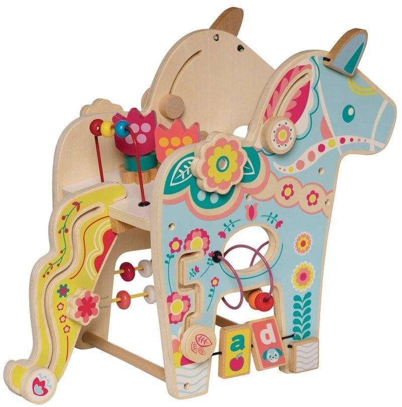 Zabawka posiada kolorowe, obrotowe obrazki, liczydło na metalowych pręcikach, ciekawe labirynty, ruchome elementy i wiele innych, z których maluchy mogą do woli korzystać. Całość została pomalowana przy użyciu bezpiecznych dla najmłodszych farb wodnych.