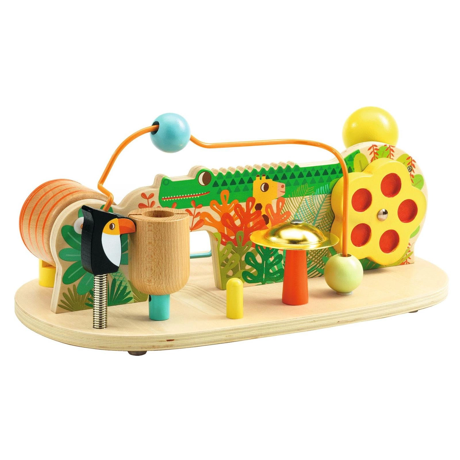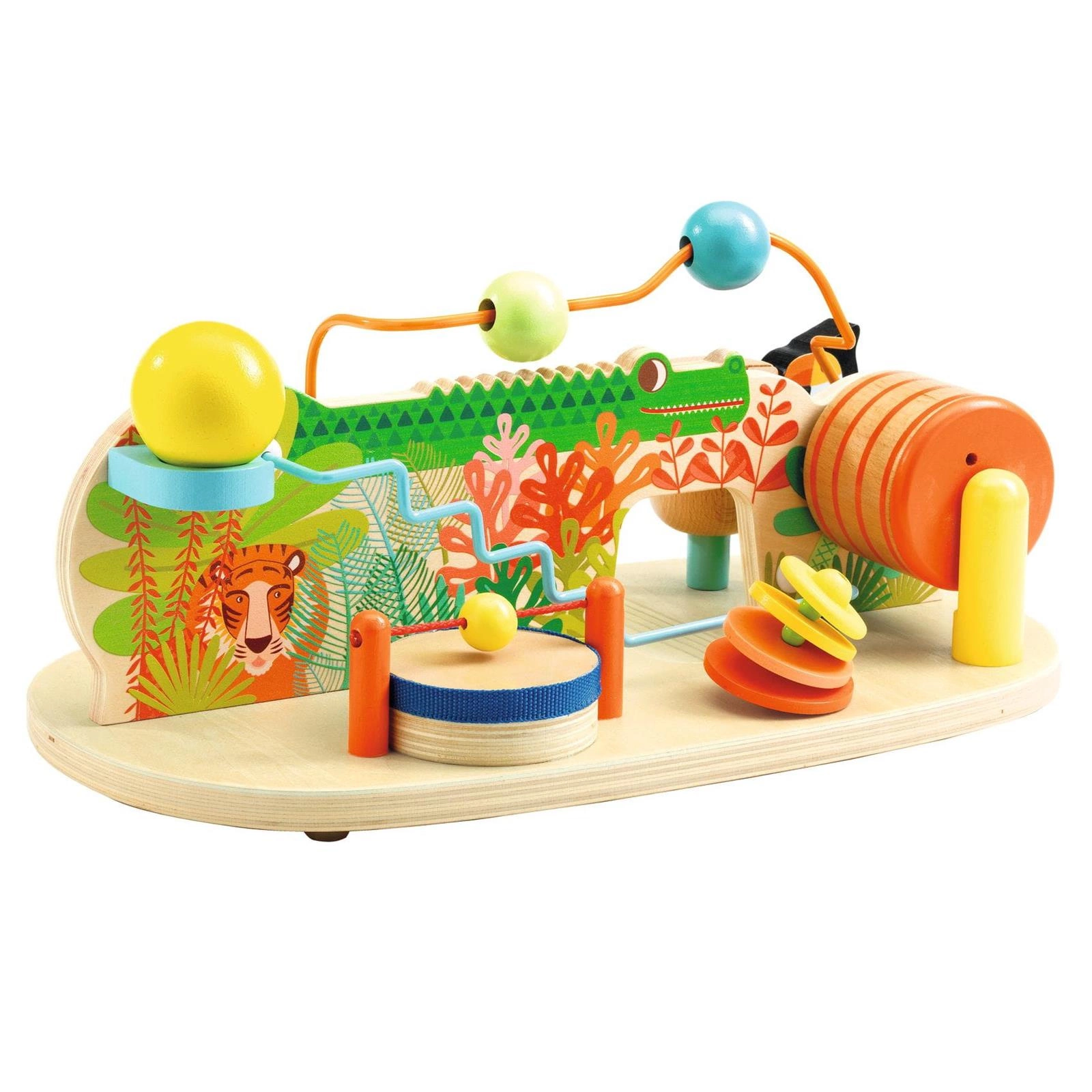 Zabawka wczesnorozwojowa ZOO to 8 dźwiękowych aktywności, które pobudzą wyobraźnię maluszków. Drewniany stolik oferuje niekończącą się zabawę z dźwiękami: "puk, puk" usłyszymy, gdy papuga na sprężynce uderzy w drewniany cylinder; "stuk, stuk" wyda z siebie obrotowe kółko; "rata, tatata" to dźwięk wydawany przez kulkę przesuwaną po grzbiecie krokodyla; "ding, ding" to metaliczny dźwięk wydawany przez obrotowy cylinder itd. Wszystkie elementy są umieszczone na drewnianej podkładce, która posiada antypoślizgowe nóżki.
