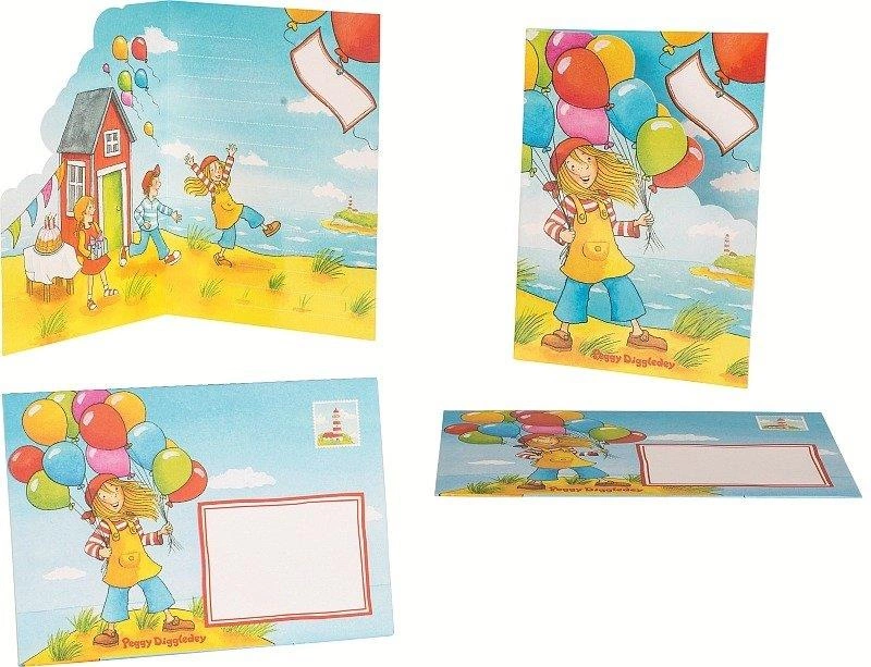 8 kolorowych zaproszeń urodzinowych z kopertą w zestawie. Zaproszenia wykonane z motywem Peggy Diggledey.