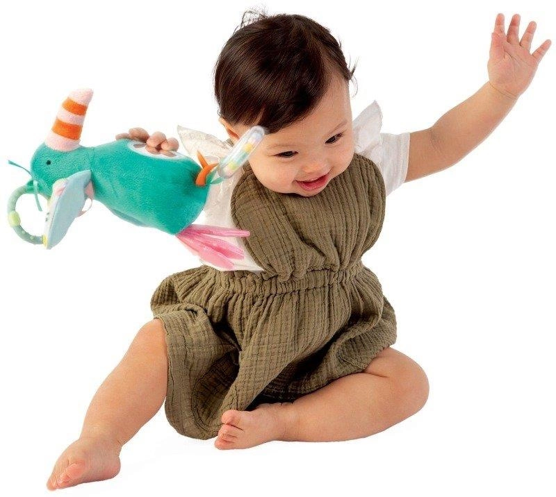 Tukan to jedna z najnowszych pluszowych zawieszek z Manhattan Toy. Śliczny gryzak dla niemowląt i grzechotka to świetny prezent na chrzciny. Podróżna zabawka składa się z miękkich tkanin, na brzuszku ma bezpieczne dla dziecka lusterko, ogon zdobią tasiemki i barwne kawałki materiału. Jego skrzydełko jest kieszonką na gryzak, a pod uroczą postacią Tukana znajduje się grzechotka z koralikami. Miękki pluszak bez wątpienia oczaruje każdego malucha, a gryzak ukoi ból dziąseł podczas bolesnego procesu ząbkowania. Dodatkowo grzechotka umożliwi niemowlakowi przeżycie nowych wrażeń sensorycznych.