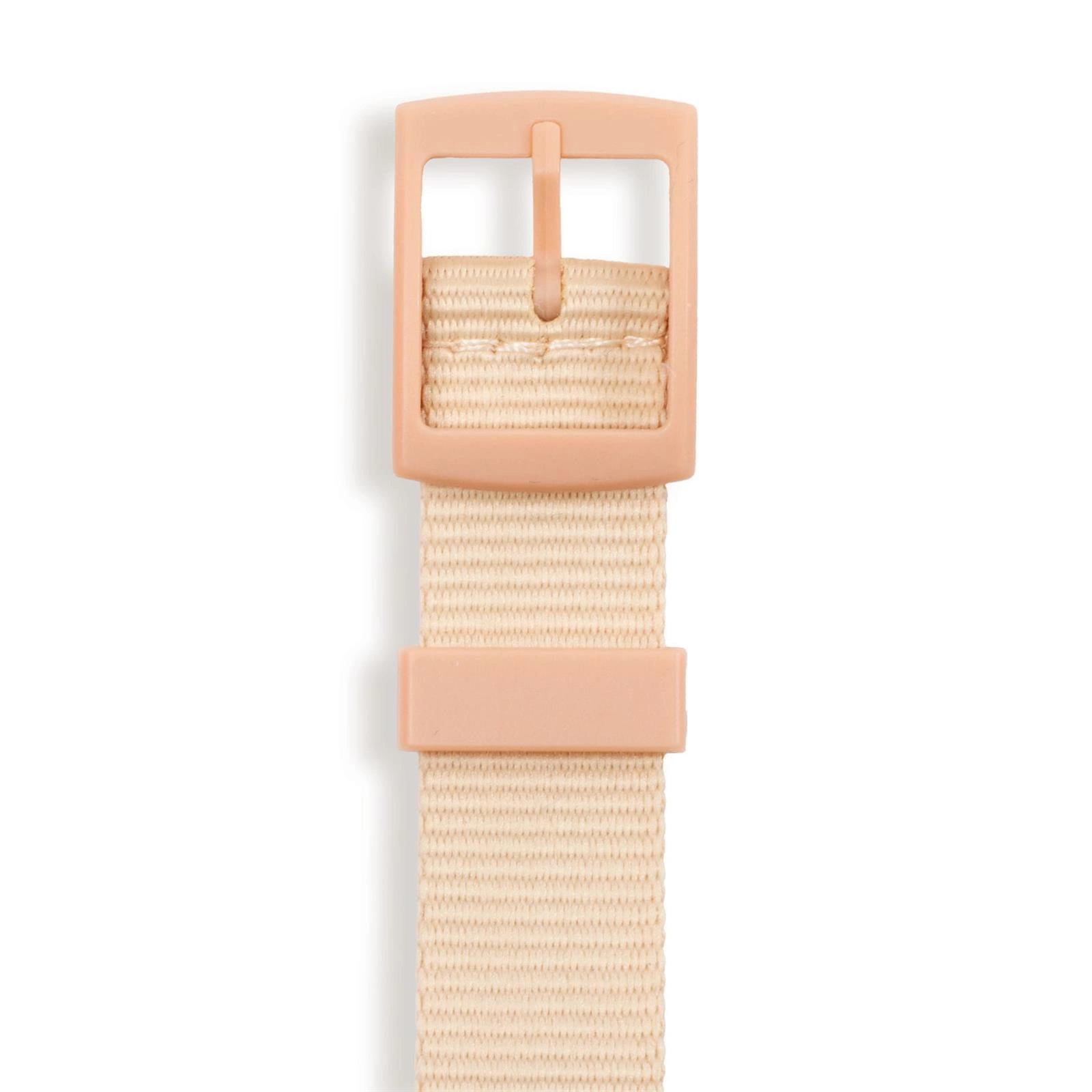 Na wyświetlaczu pojawiają się godziny, minuty i sekundy. Zegarek posiada funkcję stopera. Wodoodporny do 5 barów. Ta klasa wodoodporności oznacza, że zegarek jest odporny na zachlapania i przypadkowy kontakt z wodą. Można nosić go w czasie deszczu, w miejscach o podwyższonej wilgotności takich jak basen oraz podczas kąpieli. Nie można w nim nurkować i uprawiać sportów wodnych. Zawiera wbudowaną baterię SR626SW. Posiada 2-letnią gwarancję oraz wstrząsoodporną obudowę. Beżowy pasek z wytrzymałego materiału posiada regulację.