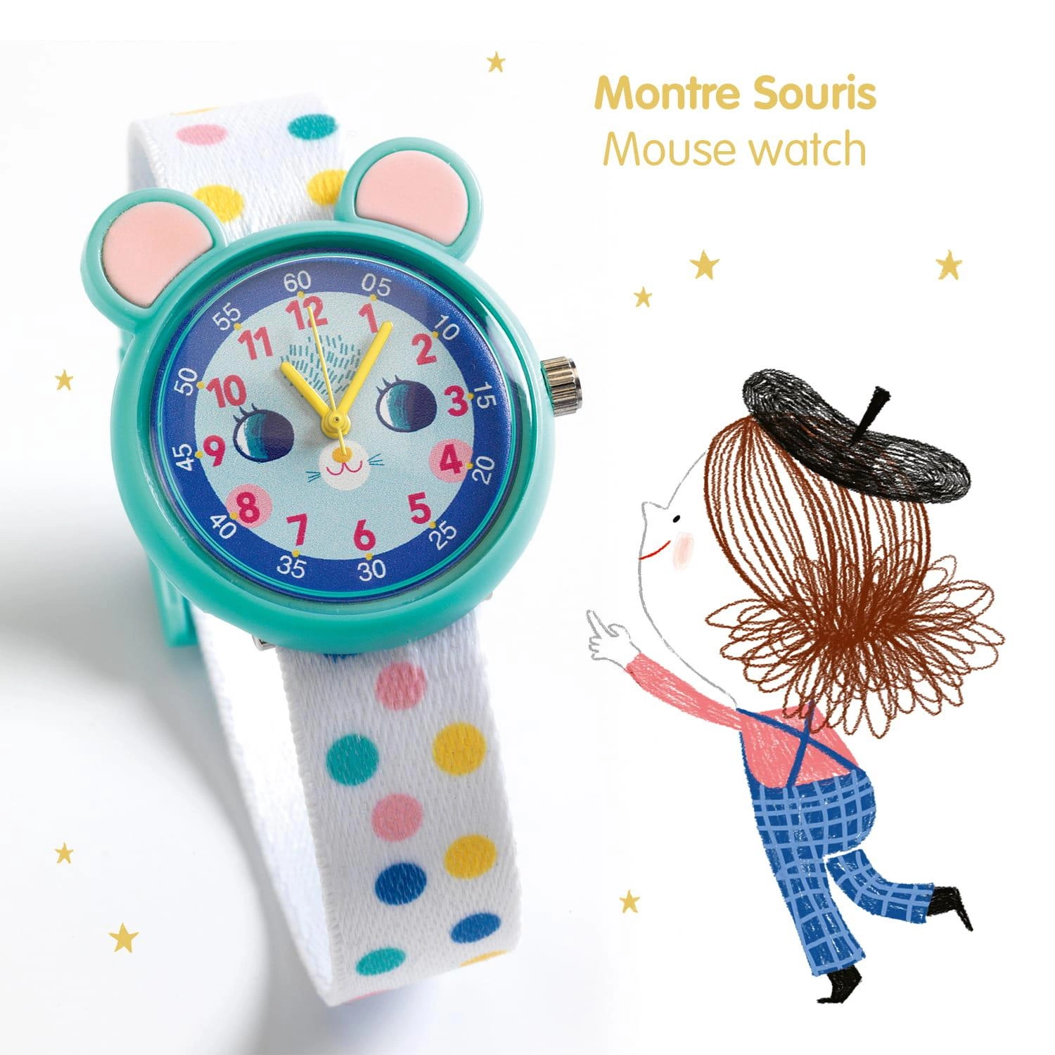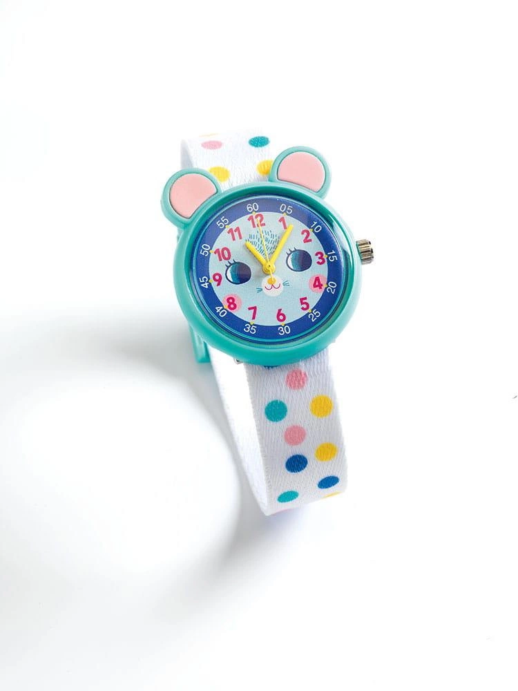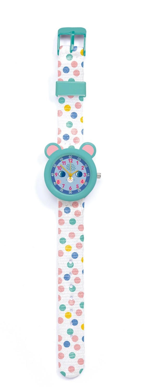 Mały zegarek dziecięcy na tekstylnym pasku będzie pasował na każdą mała rękę. Zegarek ma wielokolorowy pasek i tarczę z numerami wskazującymi godziny iminuty w odstępach 5,10,15,20 ....