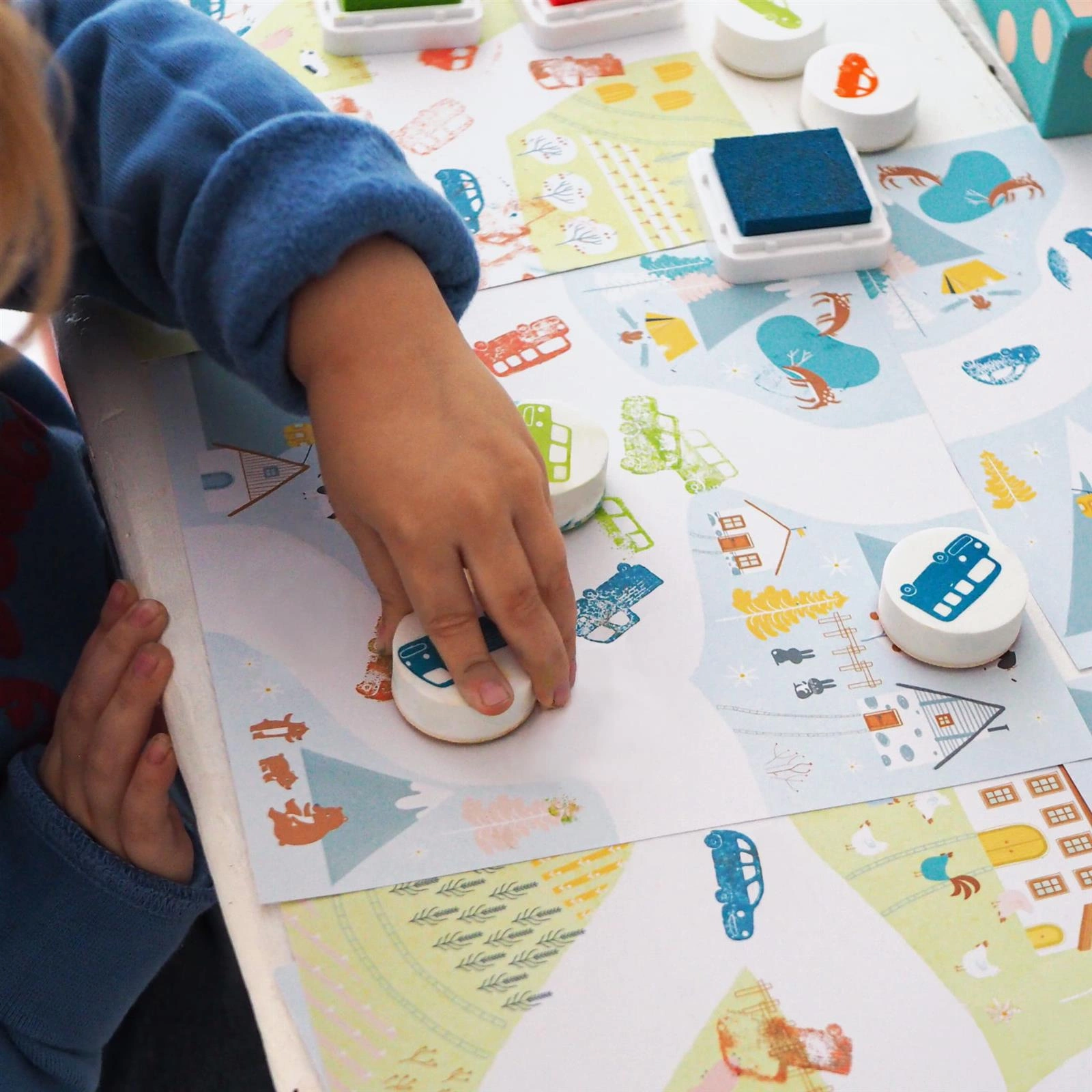 Zestaw artystyczny do tworzenia obrazów za pomocą załączonych stempelków. Wystarczy odcisnąć stempelek na poduszce z atramentem i zacząć tworzyć ilustracje. Karty mogą zostać ułożone, tak aby tworzyć bajeczne leśne ścieżki. Zabawka rozwija zdolności manualne i kreatywność. Zabawka wielokrotnego użytku: za każdym razem można stworzyć inne dzieło. Każdy stempelek posiada wzór w określonym kolorze; pomaga to utrzymać narzędzia w czystości. Atrament jest łatwo zmywalny. Poszczególne elementy wykonane są z papieru i kartonu posiadającego certyfikat FSC®.