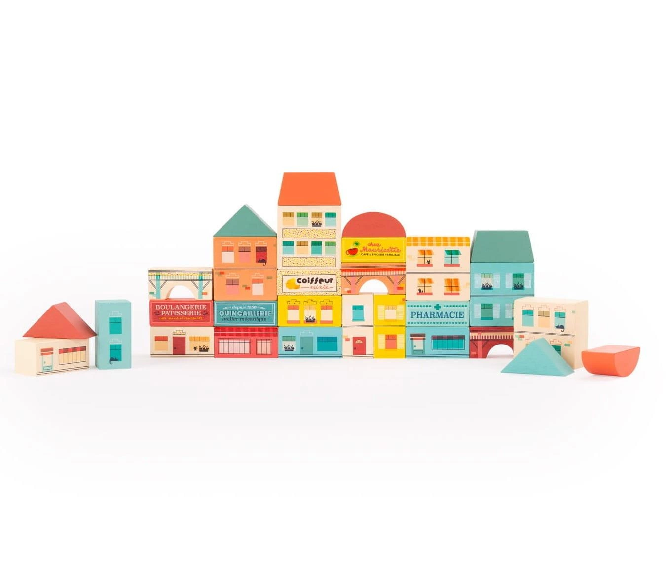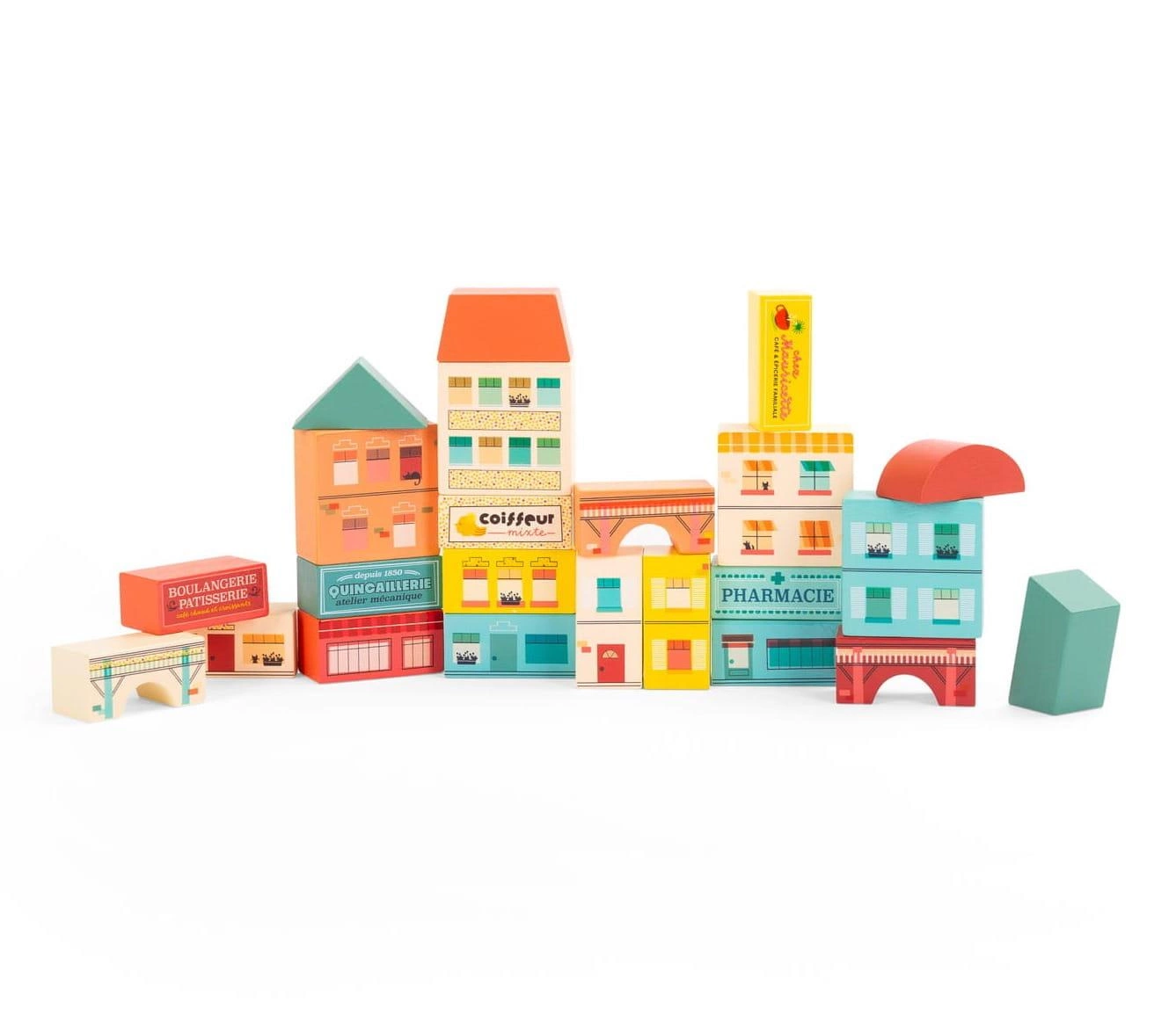 Miasto które budzi się do życia! Zestaw 34 drewnianych klocków pozwoli zbudować miasteczko, tętniące życiem, pełne domów i miejsc usługowych takich jak apteka, piekarnia czy cukiernia.