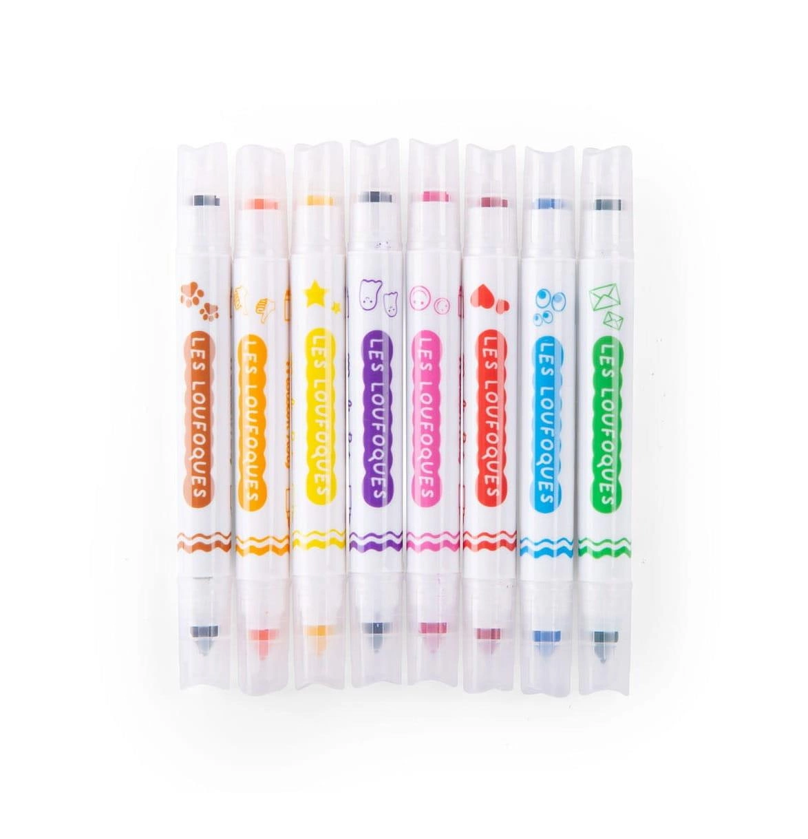 Zestaw 8 dwustronnych, kolorowych mazaków zapakowanych w pudełko z okienkiem. Opakowanie jest ilustrowane rysunkami pochodzącymi z kolekcji Les Loufoques.