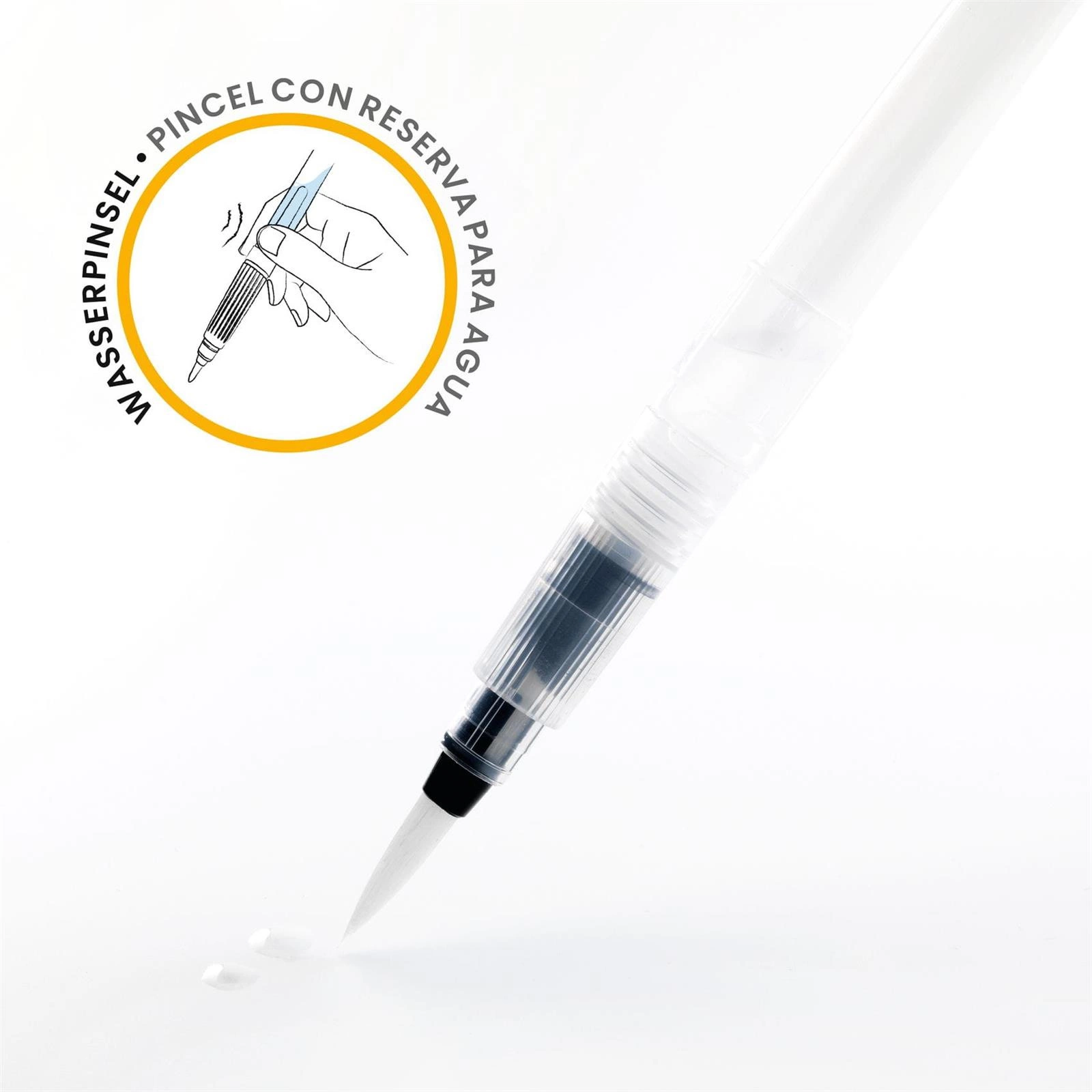 Zestaw 2 pędzelków ze zbiorniczkami na wodę. Niezbędny gadżet dla początkujących malarzy. Dzięki zbiorniczkowi rozprowadzanie kolorów nigdy nie było łatwiejsze. Za każdym pociągnięciem na kartce z farbą znajdzie się odpowiednia ilość wody. Pędzelki można przechowywać w załączonym pudełku. 2 różne końcówki.