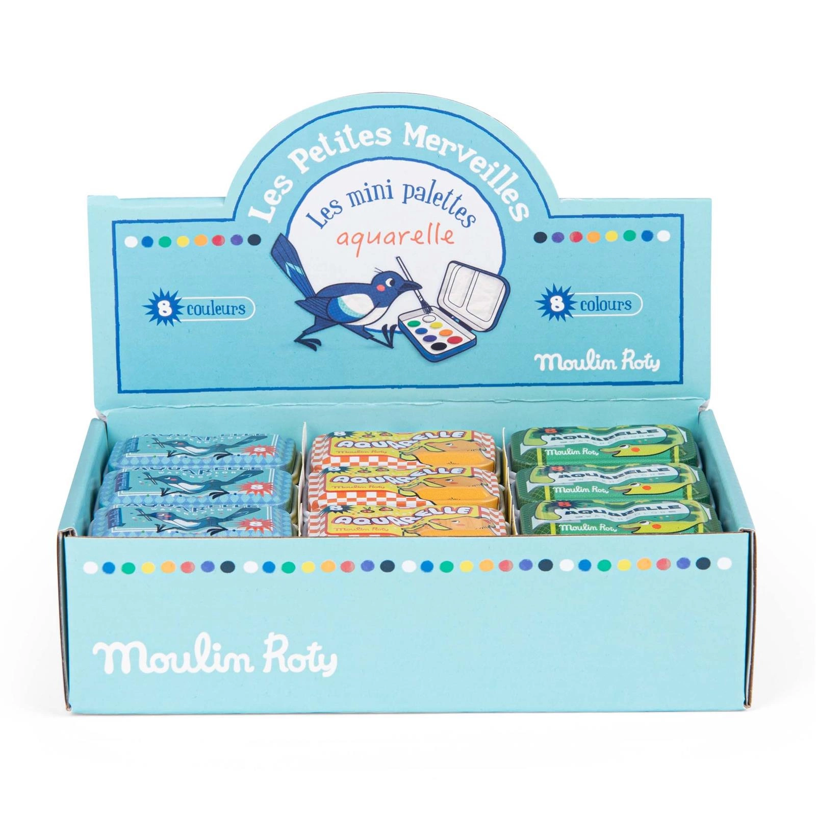 Display zawierający 36 mini paletek z farbami akwarelowymi. W każdym pudełeczku znajduje się 8 kolorów i pędzelek. Do wyboru 3 rodzaje opakowań: żółte z misiem, niebieskie ze sroką i zielone z wężem. Ilustracje utrzymane są w klimacie retro.