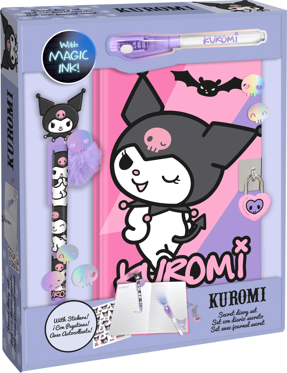 „Uwolnij swoją kreatywność dzięki temu sekretnemu pamiętnikowi i pasującemu do niego magicznemu długopisowi Kuromi.Idealny do zapisywania wszystkich sekretów i najlepszych chwil z codziennego życia. Wytrzymała okładka ma uroczy wzór Kuromi. Ponadto pamiętnik zawiera magiczne pióro, które pisze przezroczystym atramentem, czytelnym tylko za pomocą tajnej latarki. W zestawie znajduje się także zestaw naklejek z Kuromi i przyjaciółmi, które ozdobią notatki i dodadzą im osobistego charakteru. A dla dodatkowego bezpieczeństwa, jest wyposażony w kłódkę i dwa klucze, aby wszystkie twoje sekrety były bezpieczne.Czy Twoje sekrety są bezpieczne?”
