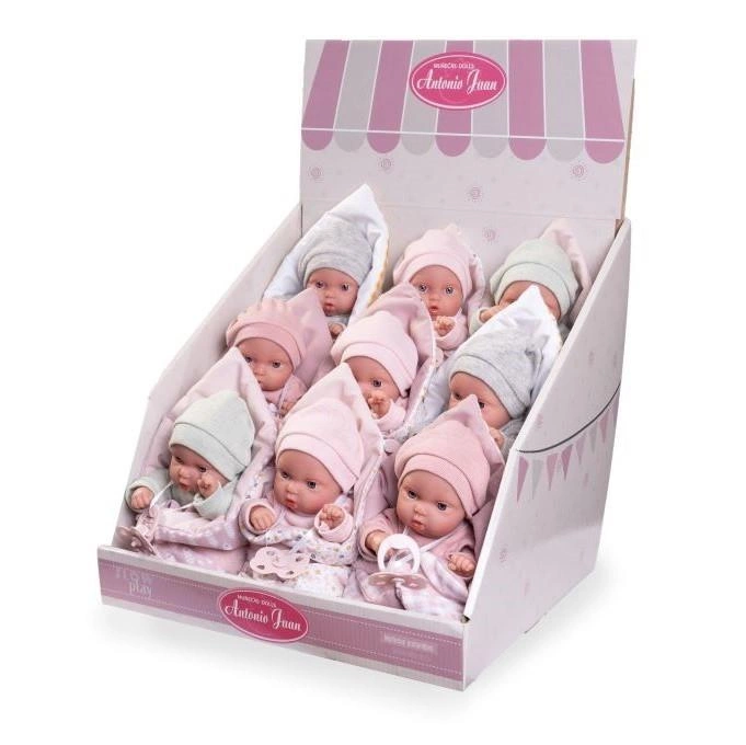 Niewielkie, winylowe lalki hiszpańskie renomowanej marki Antonio Juan, umieszczone w elegancko wyglądającym biało-różowym standzie proponujemy szczególnie do sklepów stacjonarnych. 21-centymetrowe bobaski o uroczych twarzyczkach można ustawić w pobliżu kasy, aby przyciągnąć uwagę klientów i zachęcić do zakupu oryginalnego upominku. Lalki są starannie wykonane z dbałością o najdrobniejsze detale, co czyni je idealnym wyborem na prezent. Jednolite, ręcznie szyte ubranka w pastelowych kolorach i pasujące do buzi smoczki dodają uroku, sprawiając, że są one niezastąpionym elementem w każdej dziecięcej kolekcji zabawek. Zabawka przeznaczona dla dzieci od 2 roku życia.