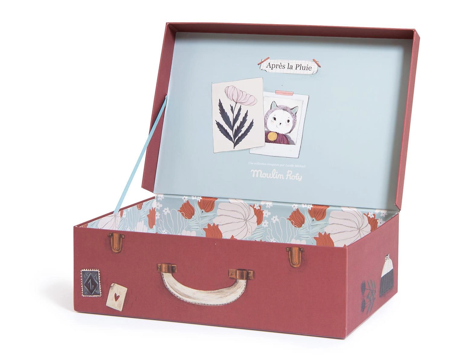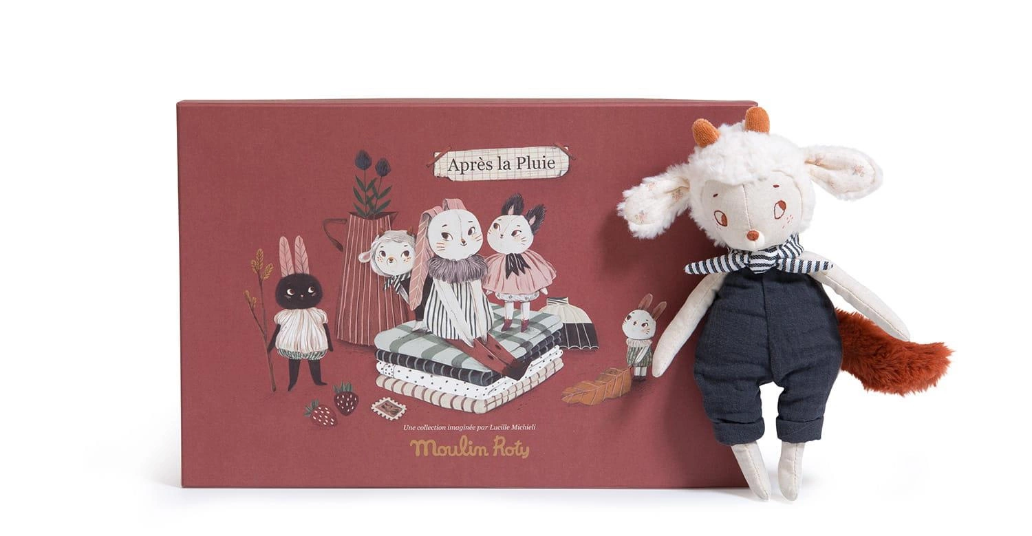 Zestaw 9 maskotek w przeuroczym pudełku imitującym walizkę. Lune to ciemnoszary króliczek ubrany w białą bluzeczkę i wzorzyste spodenki. Owieczka Nuage to uroczy pluszak ubrany w ciemne ogrodniczki i apaszkę w paski. Natomiast Brume to jasnobeżowy króliczek o puszystych uszach, ubrany w pelerynkę z czarną kokardką. Wszystkie zwierzątka pochodzą z kolekcji Apres La Pluie.