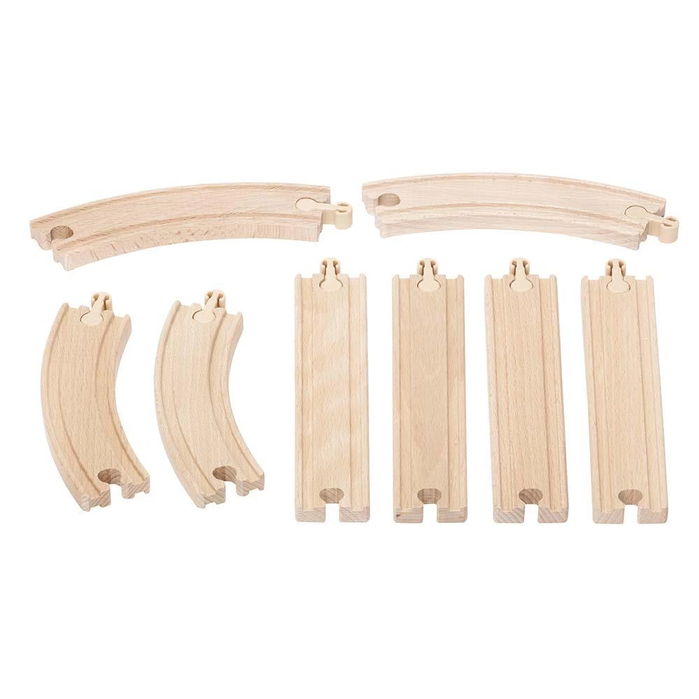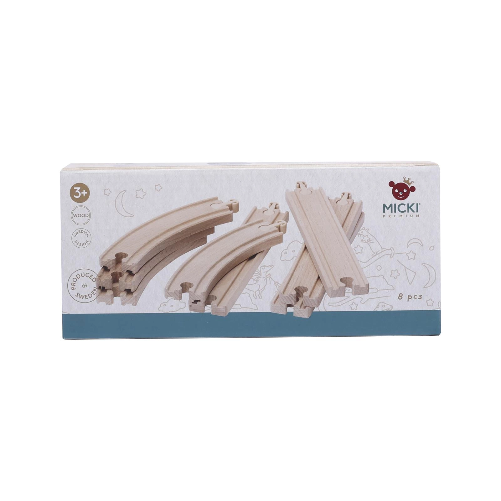Klasyczne drewniane elementy torów kolejowych - produkcja szwedzka! Ten zestaw akcesoriów idealnie pasuje do zestawu kolejowego Micki i zawiera 8 elementów torów. Można go również używać z zestawami kolejowymi innych marek dostępnych na rynku.