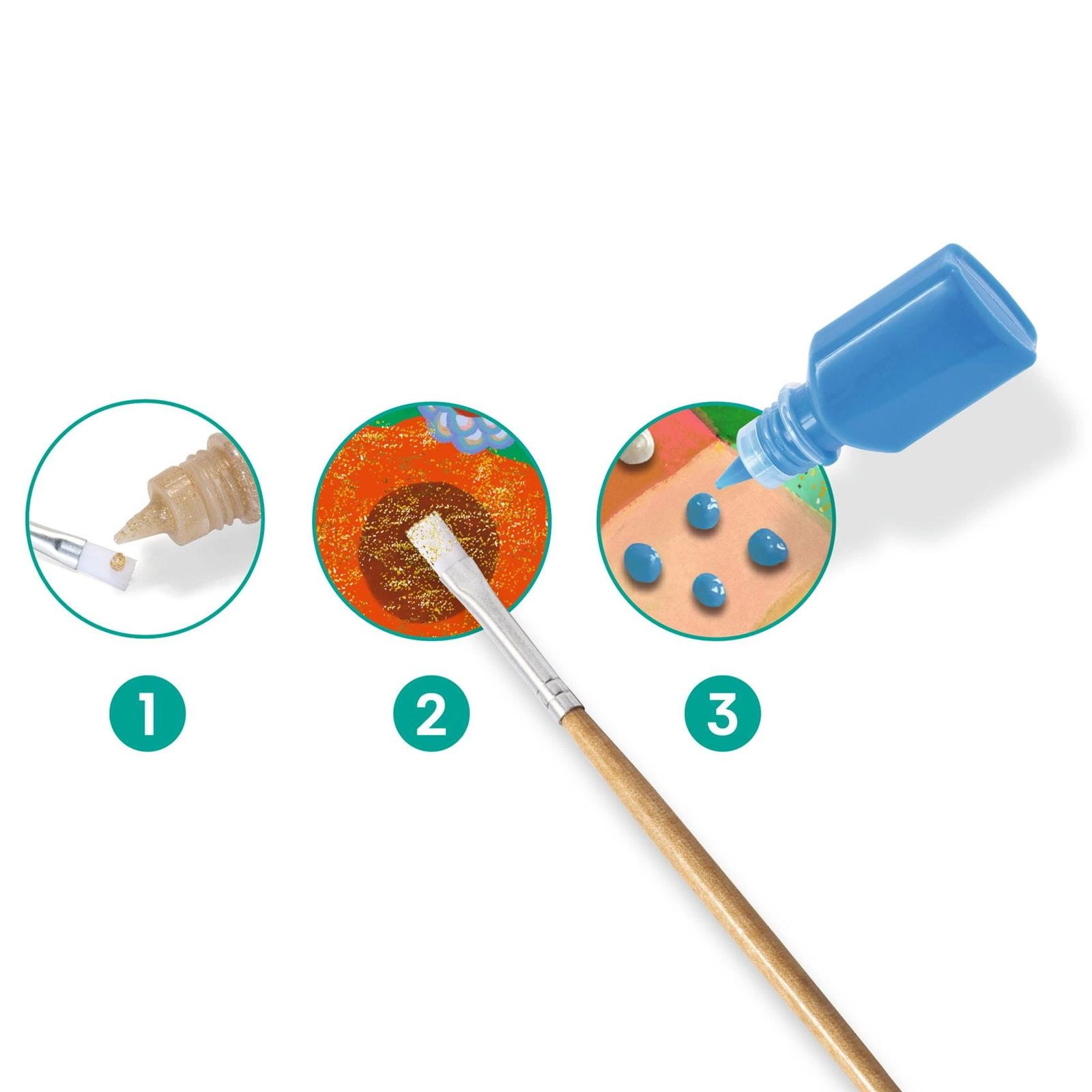 Zawartość: 4 ilustrowane obrazy do uzupełnienia (21 x 28 cm), 8 kolorów farb, 1 pędzelek, instrukcja krok po kroku.
