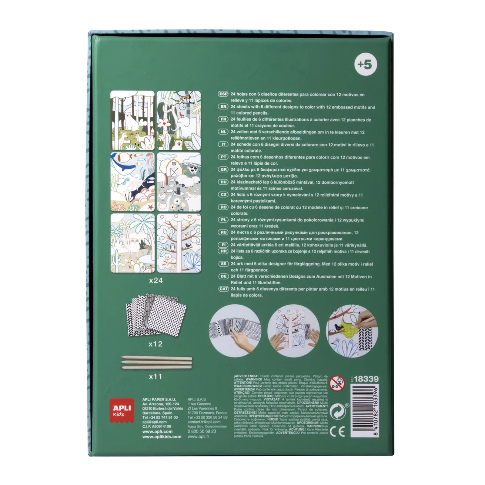 Wyjątkowy zestaw artystyczny Apli Kids do malowania różnymi teksturami. Wystarczy wybrać jeden arkusz z wypukłymi wzorami, umieścić go pod kartką i pokolorować. Wow! Wzory pojawią się na rysunku! Zestaw zawiera wszystkie elementy do wykonania zadania: 24 kartki z 6 różnymi ilustracjami, 12 kartek z różnymi teksturami, 11 kolorowych kredek i karty z przykładami. Zestaw artystyczny ma dużą wartość dydaktyczną: stymuluje drobne zdolności motoryczne, rozwija kreatywność i zdolności manualne. Zapakowany w kartonowe pudełko. Idealnie sprawdzi się na prezent.