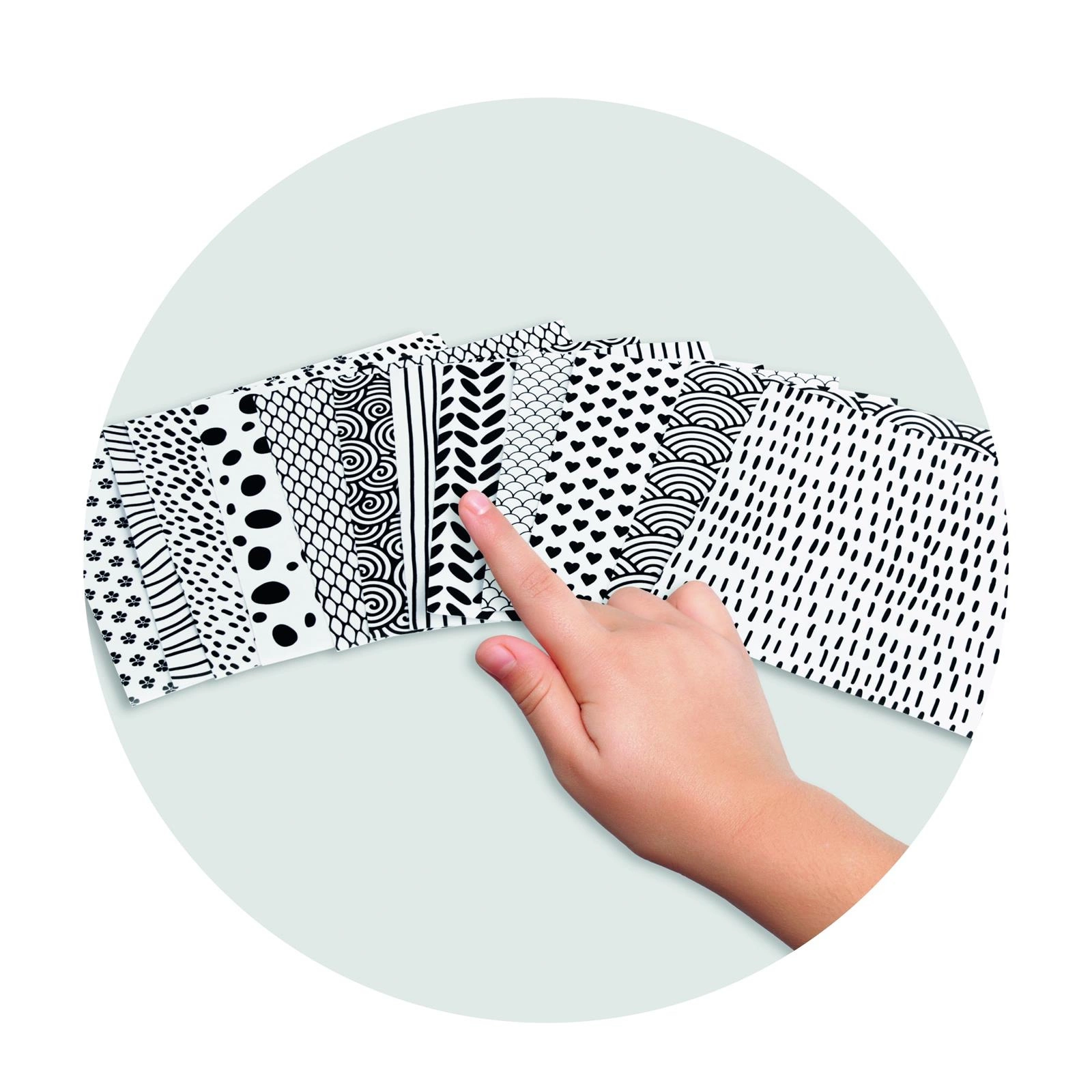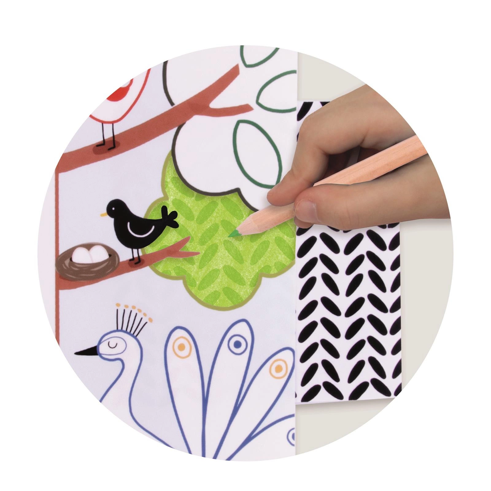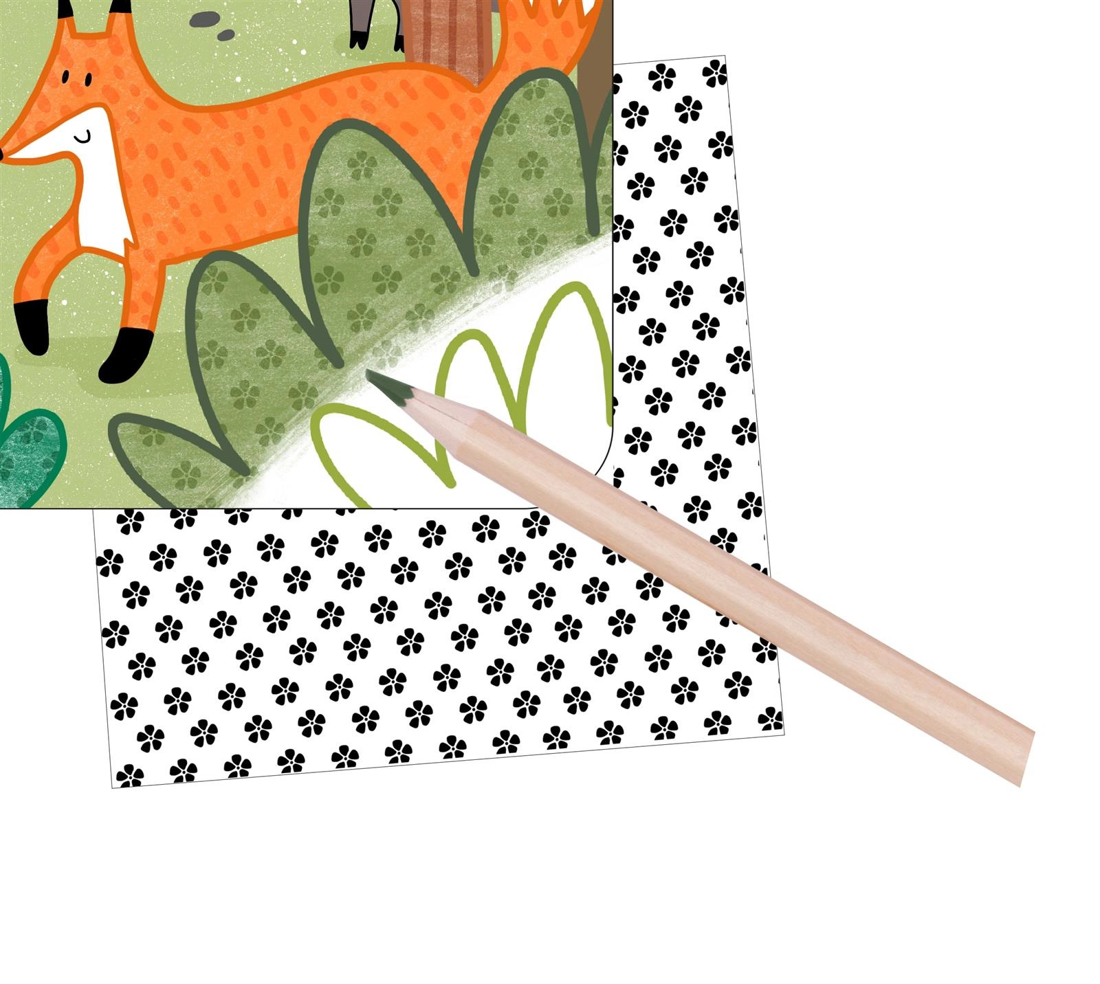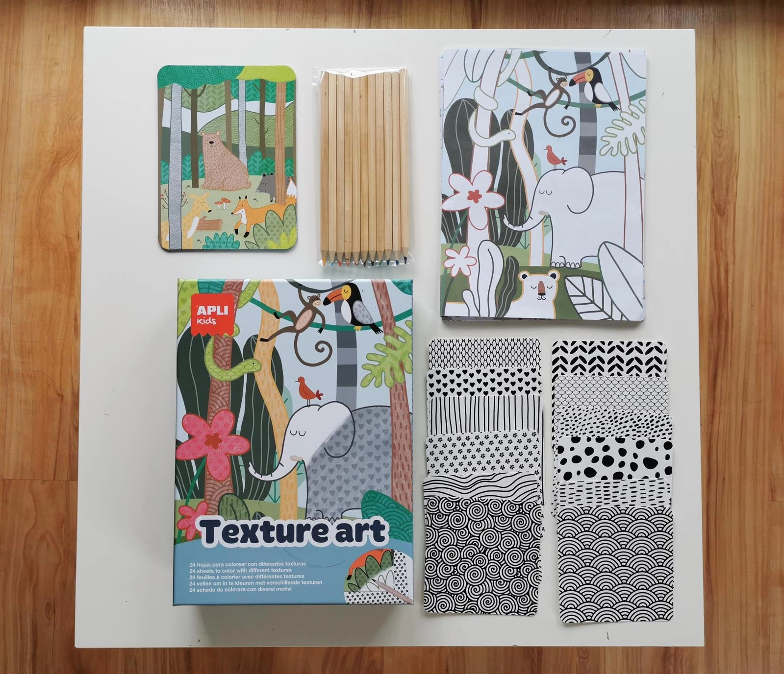 - w zestawie: 24 kartki z 6 różnymi ilustracjami, 12 kartek z różnymi teksturami, 11 kolorowych kredek i karty z przykładami