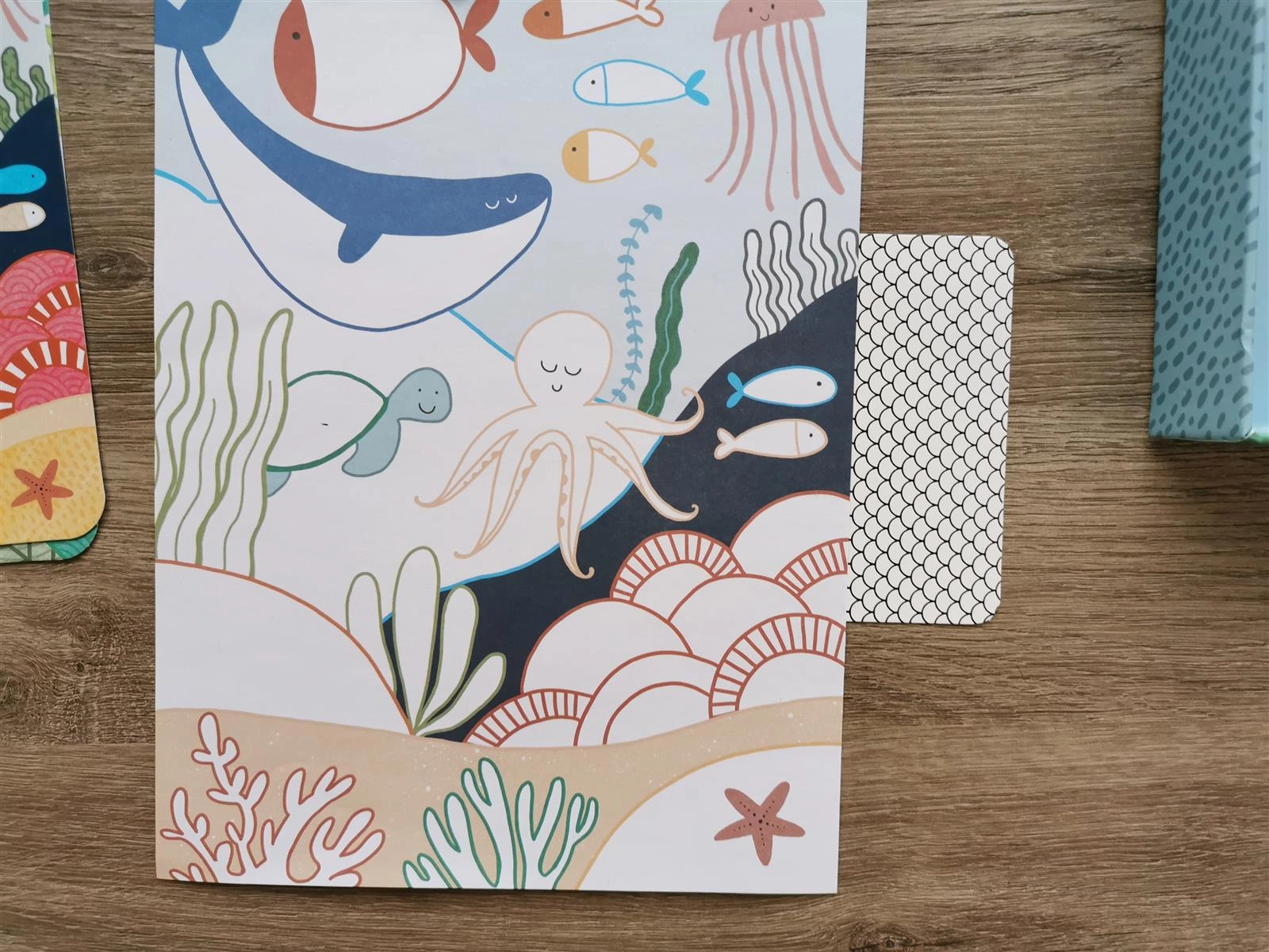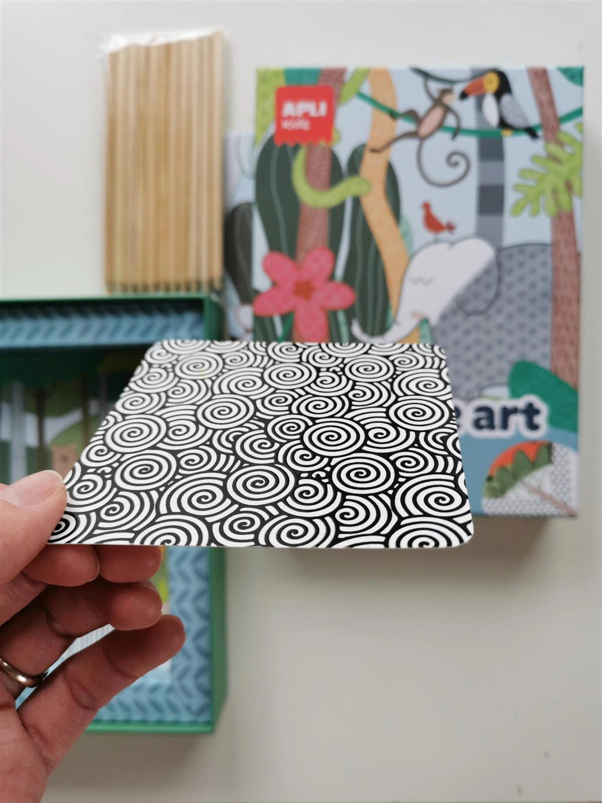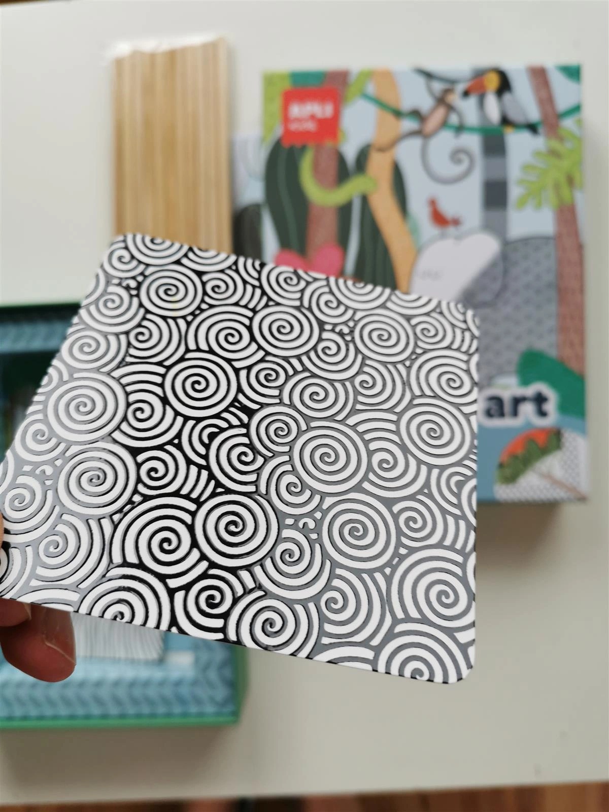 - w zestawie: 24 kartki z 6 różnymi ilustracjami, 12 kartek z różnymi teksturami, 11 kolorowych kredek i karty z przykładami
