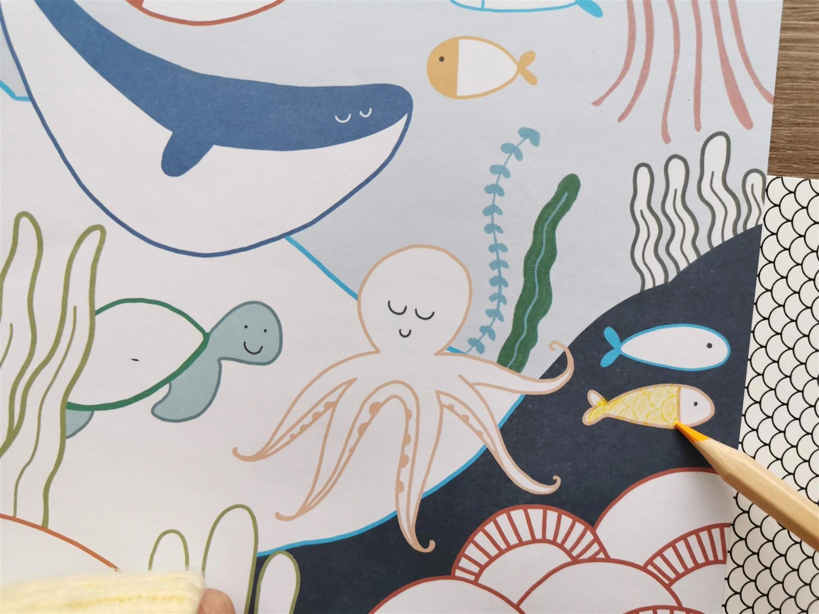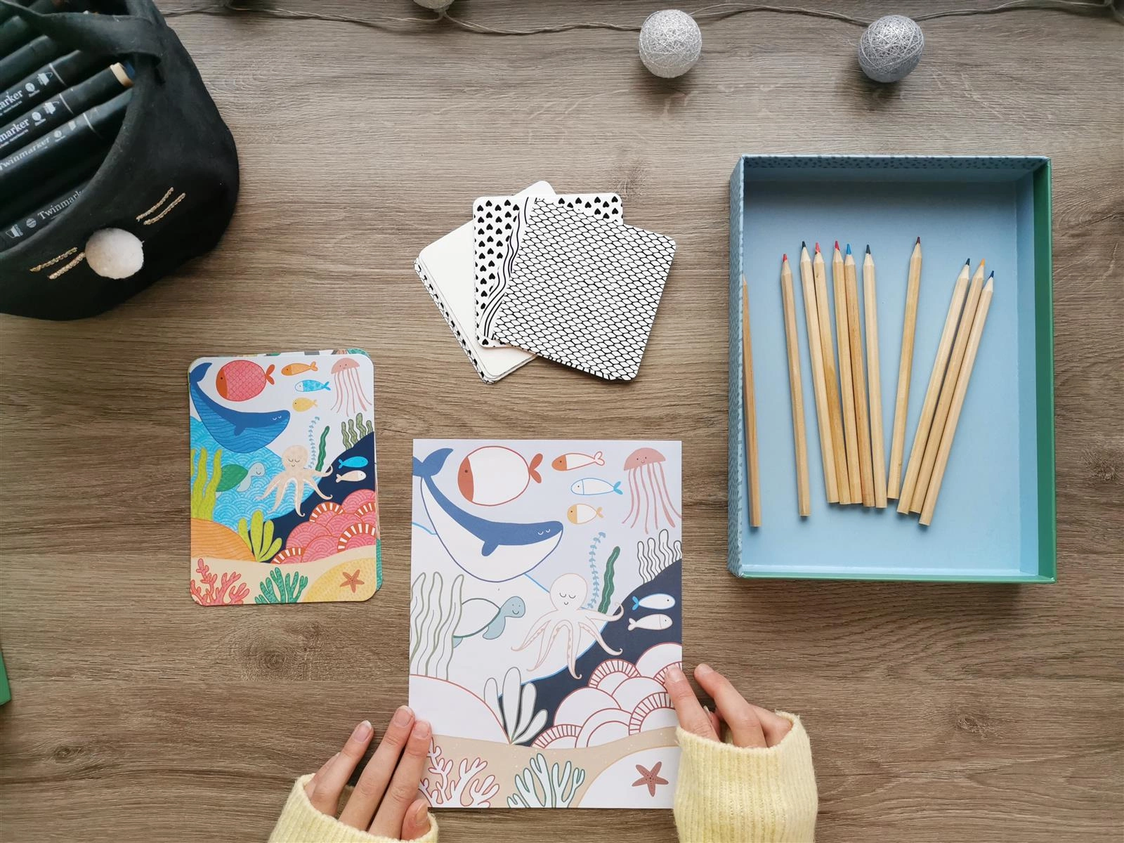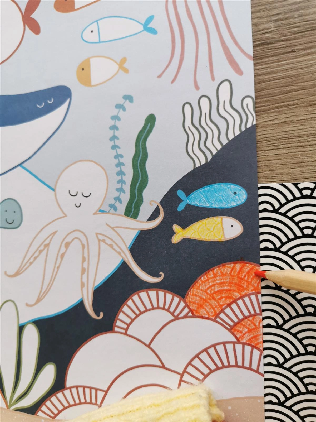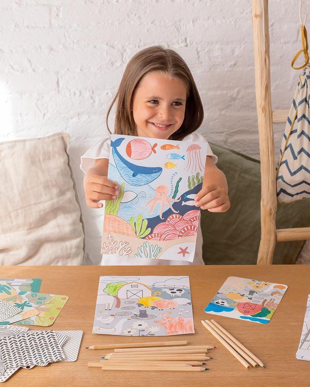 - w zestawie: 24 kartki z 6 różnymi ilustracjami, 12 kartek z różnymi teksturami, 11 kolorowych kredek i karty z przykładami
