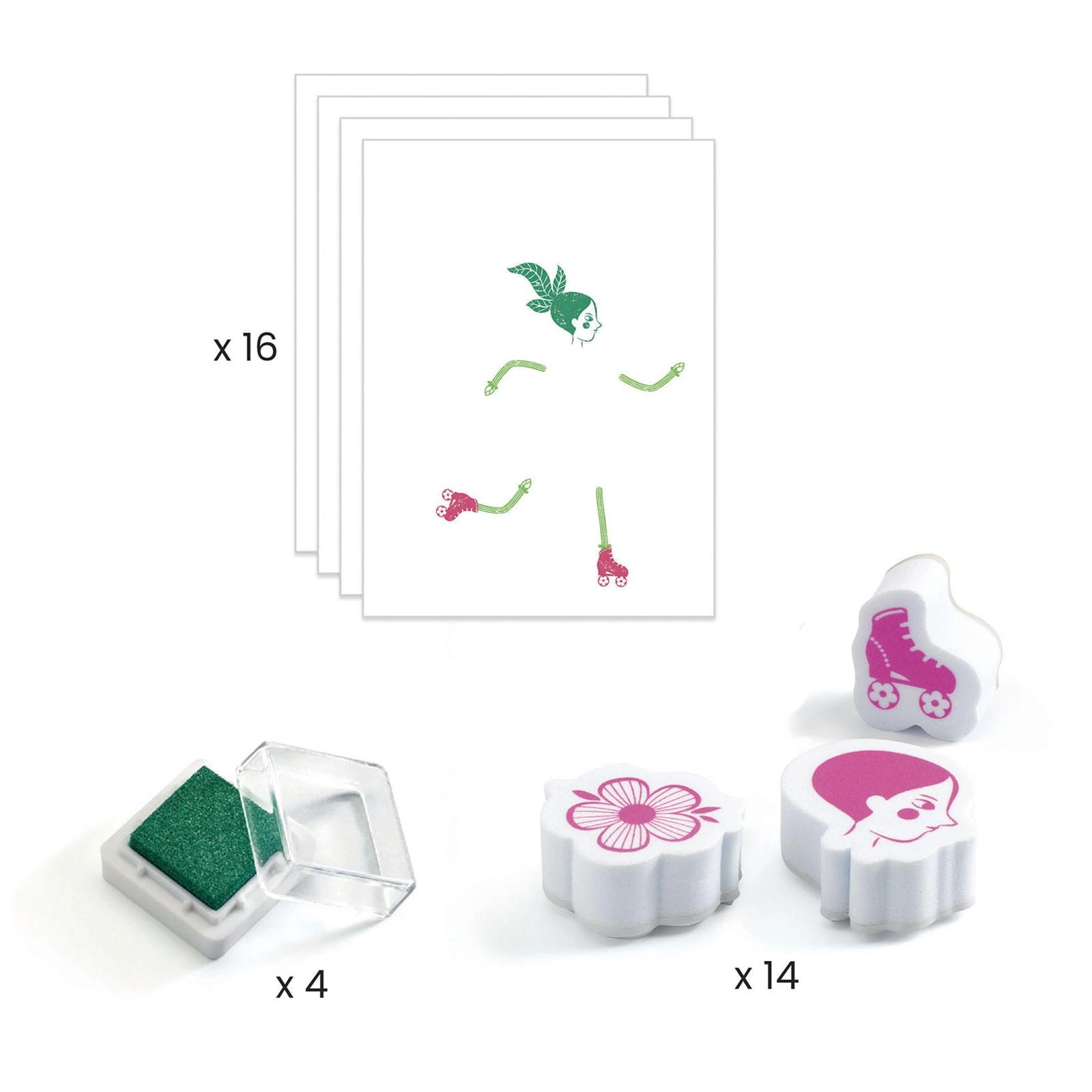 Zestaw artystyczny z pieczątkami, z których dziecko komponuje własne postacie. Łącząc kształty i różne kolory, tworzy śliczne, kwieciste stroje.