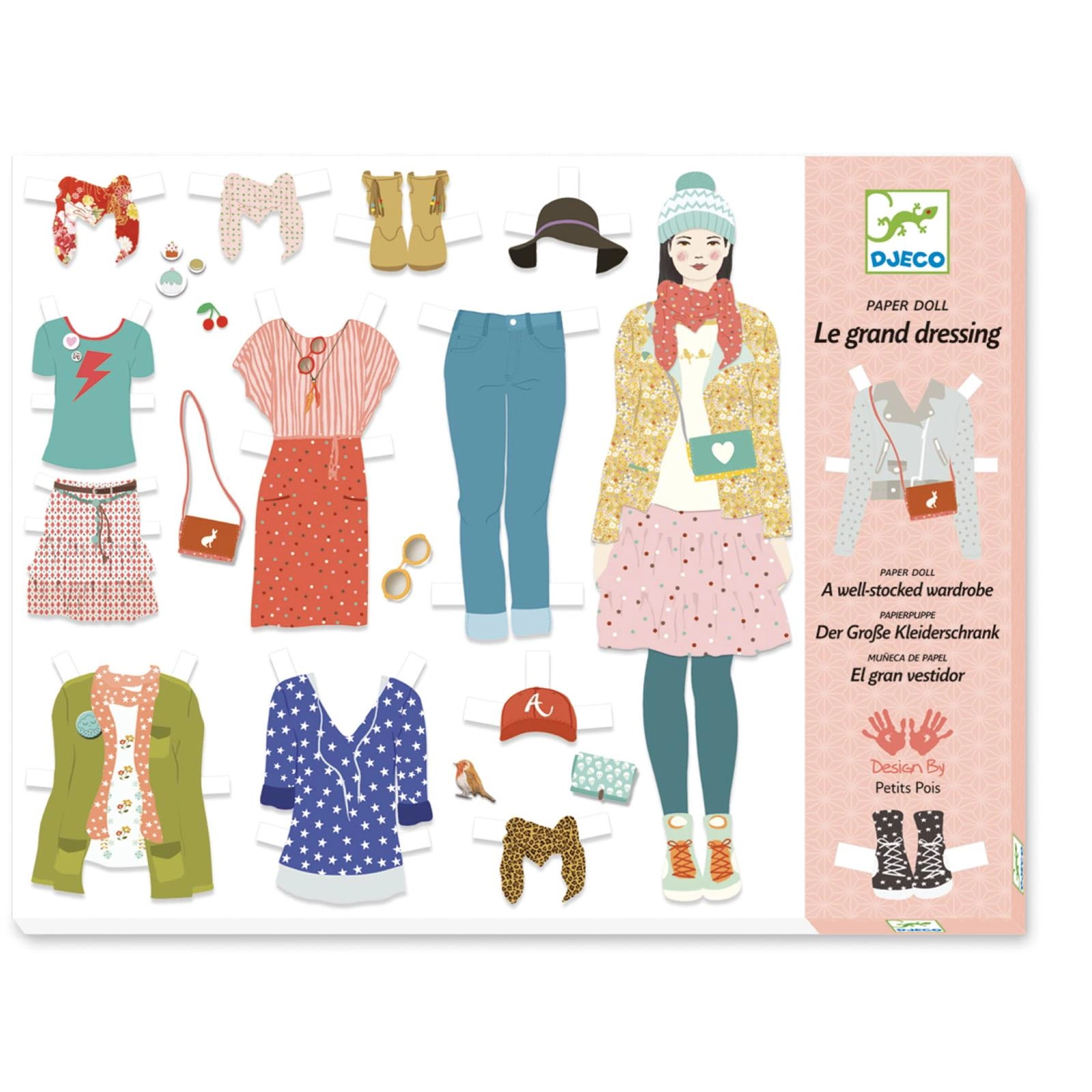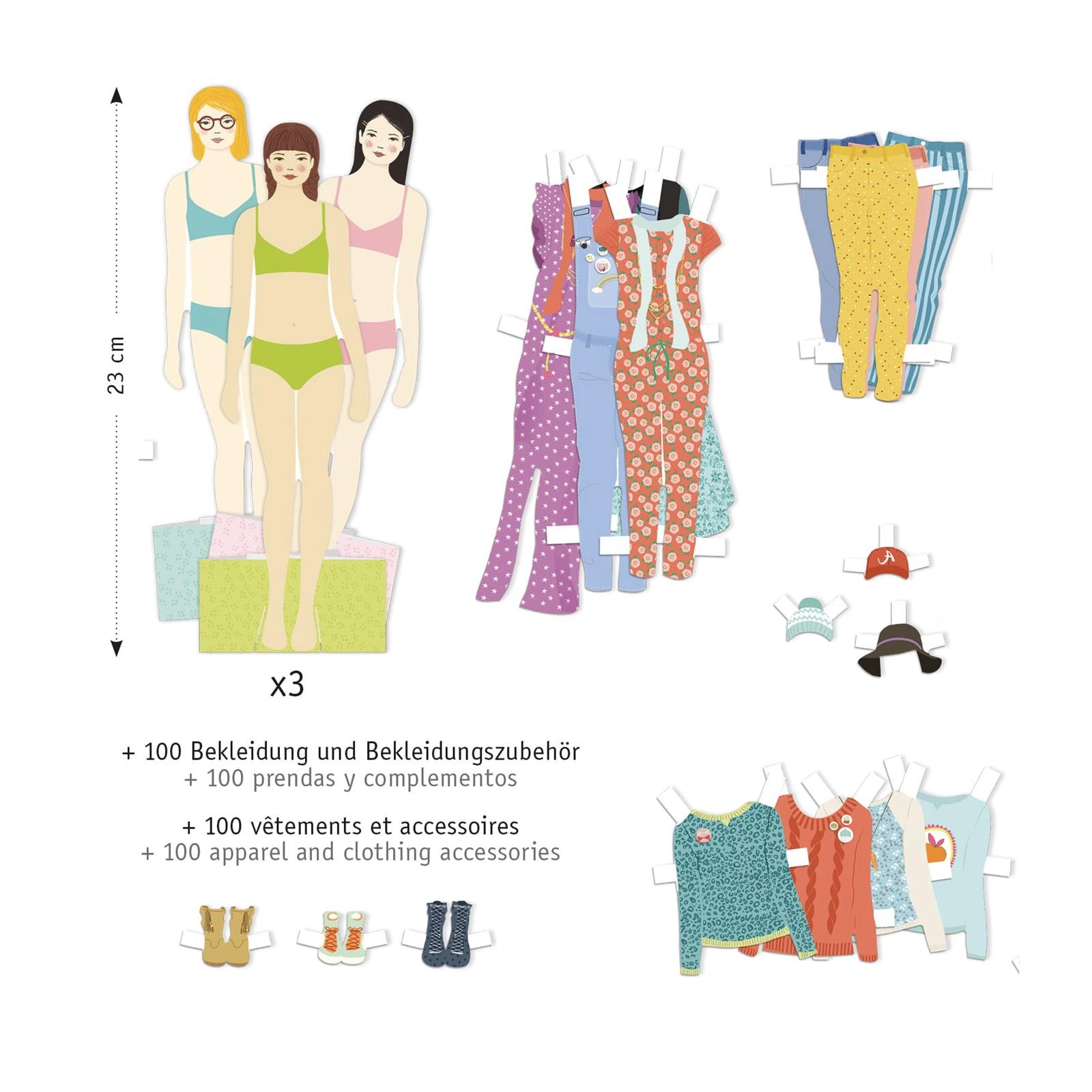 Zestaw obejmuje 3 małe dziewczynki wykonane z grubego kartonu, w dużym pudełku, z przegródkami do przechowywania wielu ubrań.