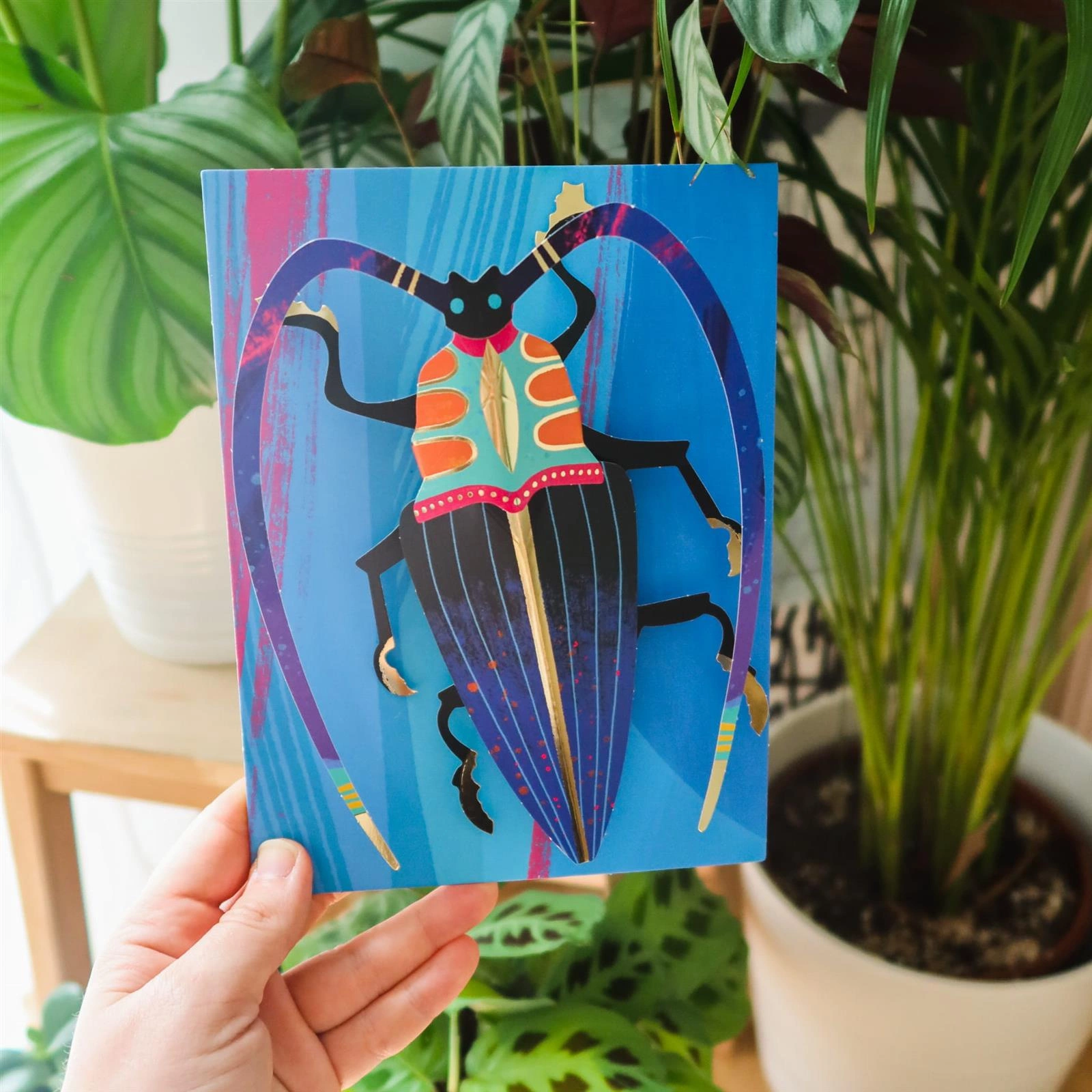 Zestaw artystyczny, który łączy w sobie składanie i sklejanie, aby stworzyć 4 piękne mieniące się złotem owady w 3D! Dziecko składa wycięte wcześniej kawałki papieru i tektury, a następnie składa je w całość za pomocą kleju, dwustronnych naklejek.