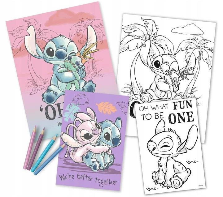 Ten zestaw zawiera dwie kolorowanki z różnorodnymi obrazkami Stitcha, które zapewnią godziny zabawy oraz rozwijania umiejętności artystycznych i motorycznych.