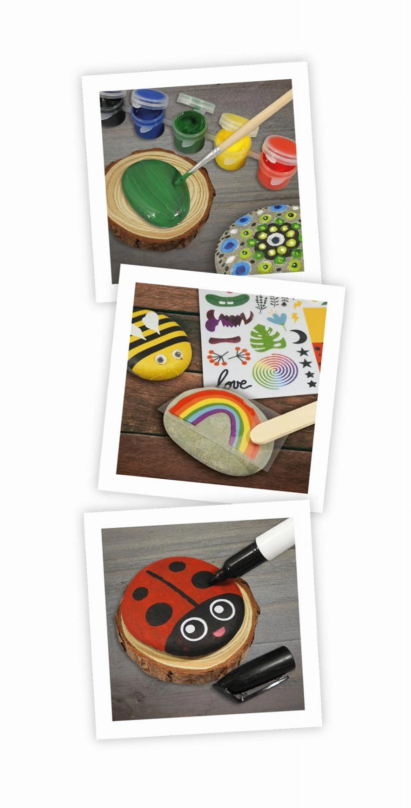 Zestaw zawierający 10 prawdziwych kamieni do pokolorowania! Wybierz jeden z nich i ozdób go farbkami, mazakami lub naklejkami. Stwórz niepowtarzalny kamyczek, który ozdobi pokój lub będzie prezentem dla przyjaciela. Po ozdobieniu całego zestawu kamyczki mogą służyć do zabawy w szukanie: ukryj je w ogrodzie lub w całym domu i urządź zawody, kto odnajdzie najwięcej.