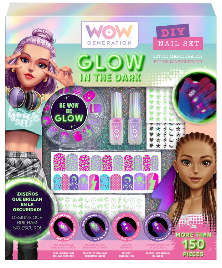 "Zestaw do manicure WOW GLOW in the Dark - świecące paznokcie, niepowtarzalny styl i totalna zabawa!Gotowa na magiczną sesję paznokciową?Dzięki zestawowi WOW Nail DIY Kit będziesz mieć ponad 100 elementów do stworzenia niesamowitych paznokci... które świecą w ciemności! Zawiera wszystko, czego potrzebujesz do manicure WOW:10 świecących w ciemności sztucznych paznokci10 świecących naklejek do ozdobienia paznokci2 arkusze mini świecących naklejek2 żywe lakiery do paznokci: różowy i liliowy 1 super zabawny pilnik do paznokci Maluj, przyklejaj, świeć i stwórz własny styl paznokci.Idealny do zabawy w pojedynkę, z przyjaciółmi lub dołączenia do klubu WOW z mnóstwem kolorów i osobowości.Uwielbiasz wyrażać siebie za pomocą brokatu i kolorów?W takim razie... ten zestaw jest dla Ciebie!"