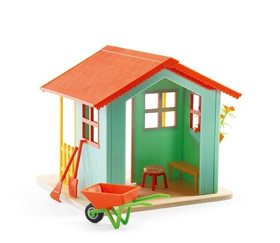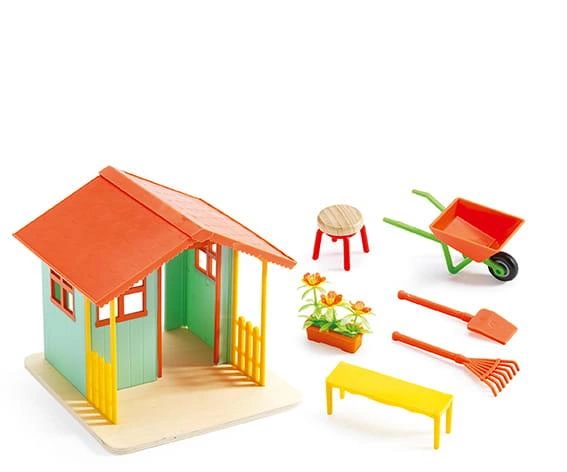 Domek gospodarczy to uzupełnienie zestawów domku dla lalek. Zestaw zawiera wyposażenie -taczka, konewka ,grabie, łopata .