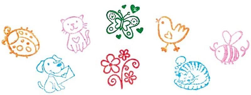 W komplecie znajduje się 8 różnych stempelków z motywami roślinek i zwierzątek, które mogą się kojarzyć z miejskim klimatem. Wśród nich znajdziemy m.in.: