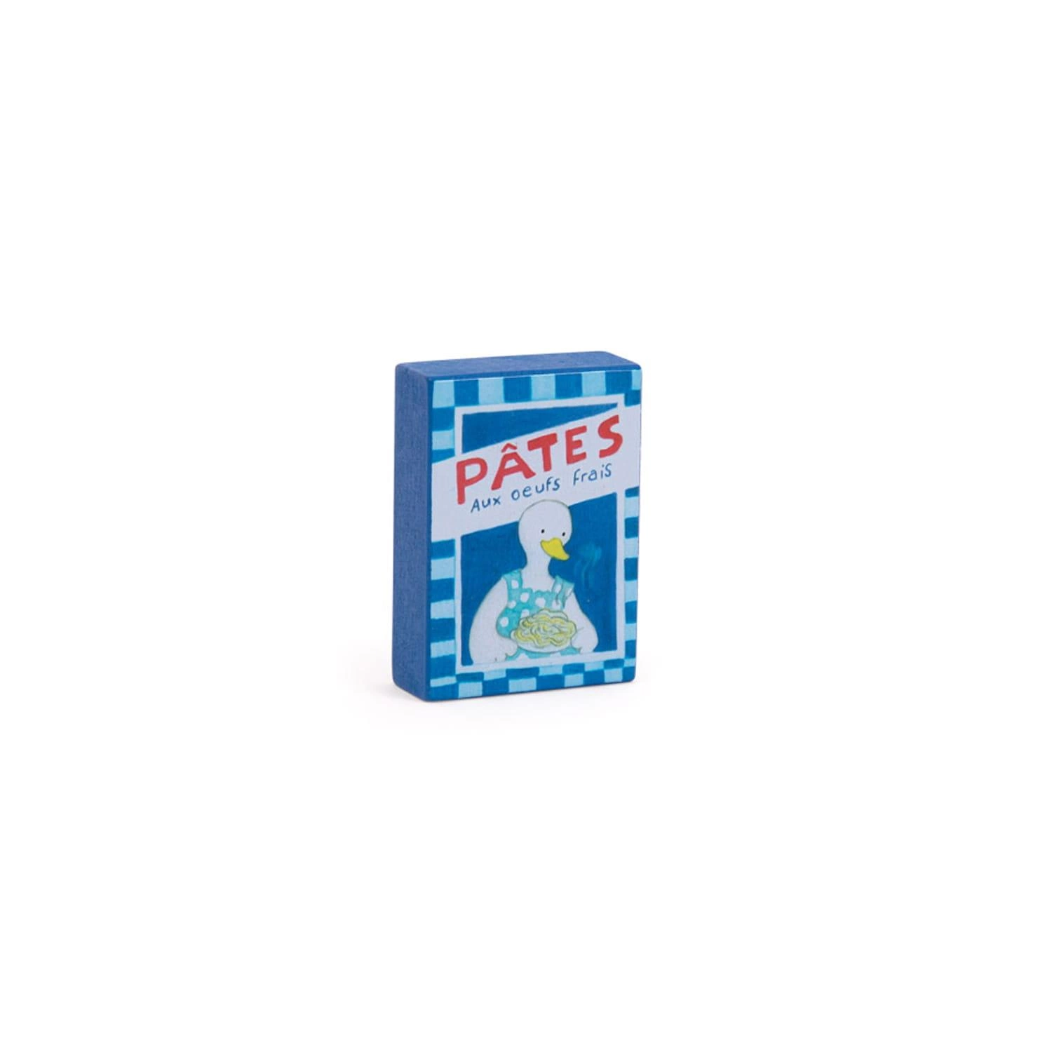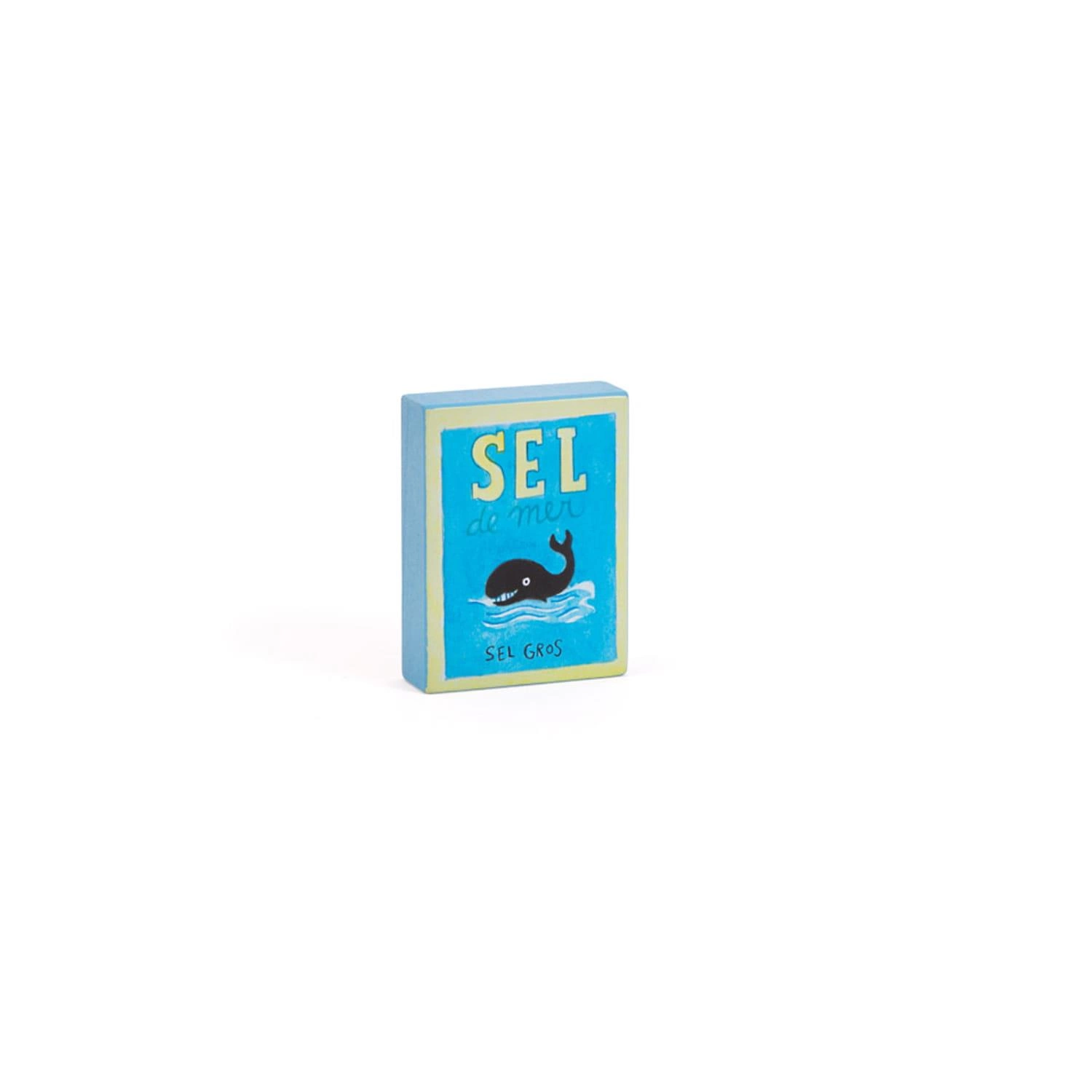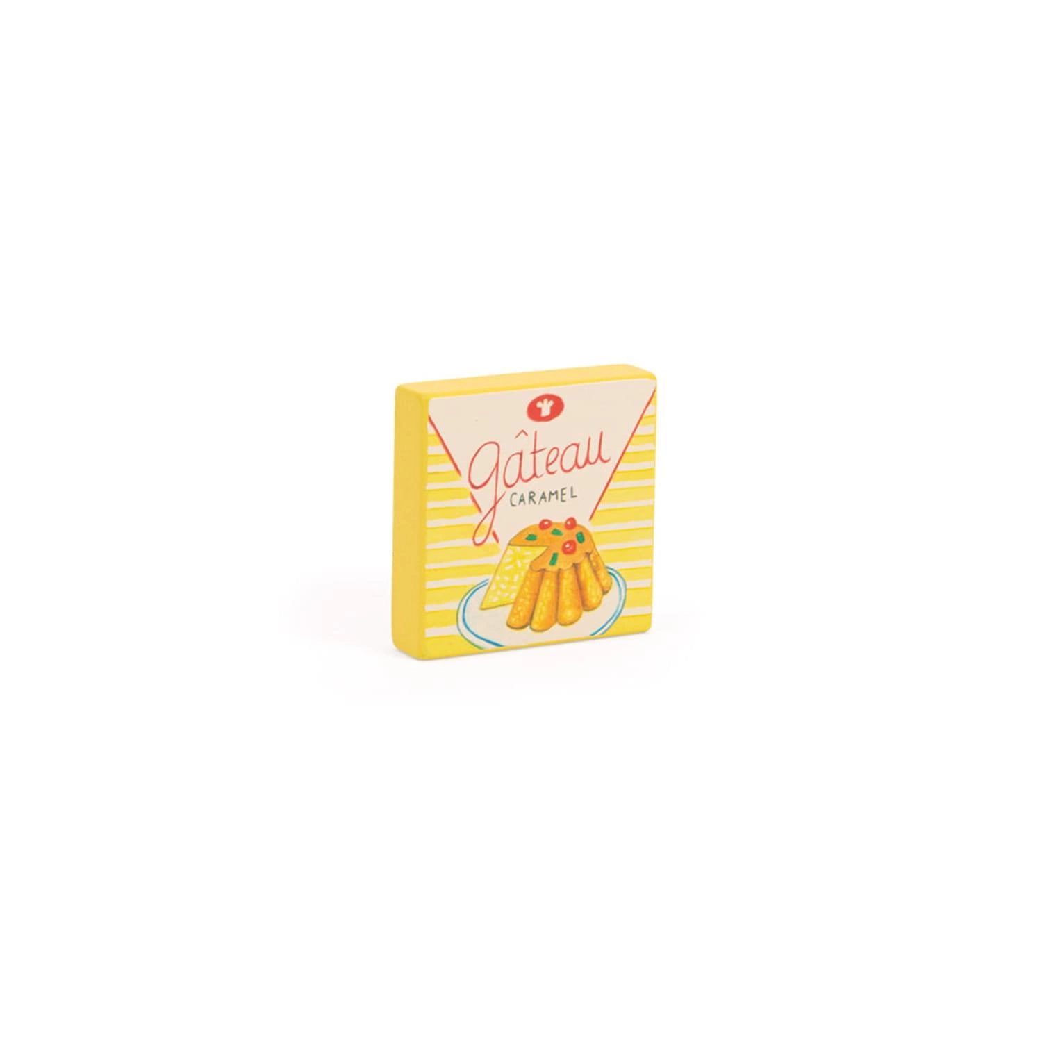 Drewniana skrzyneczka z 7 produktami spozywczymi - czekoladą, sardynkami w