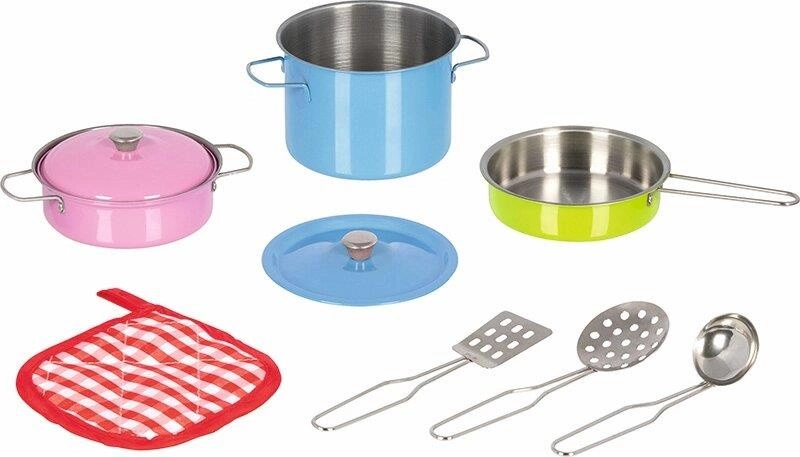 Zestaw metalowych garnków i akcesoriów to kolejna propozycja kulinarnej zabawki od marki Goki. Z tymi kolorowymi garnkami ugotowanie makaronu dla misia, czy wyśmienitej zupy dla lalki to żaden problem. Garnki zostały przystosowane wielkościowo do małych rączek dziecka. Urozmaicony zestaw garnków wraz z pokrywką, rękawicą oraz innymi przyborami kuchennymi ( chochla, łopatka i łyżka cedzakowa ) sprawi, że dzieci poczują się jak prawdziwi kucharze. Ten zabawkowy zestaw do gotowania oferuje możliwość naśladowania dorosłych, jak również wspiera dzieci w rozwijaniu umiejętności z zakresu małej i dużej motoryki. Wydawanie potraw, a wcześniej także przyjmowanie zamówień to doskonały sposób na trening komunikacji. Poszczególne elementy zestawu stworzone zostały z wysokiej jakości metalu, dlatego też ta zabawka posłuży dzieciom przez więcej niż jedno pokolenie. Zestaw małego kucharza Goki to idealny pomysł na prezent dla chłopca i dziewczynki.