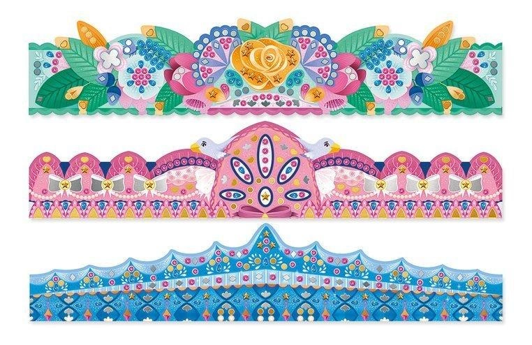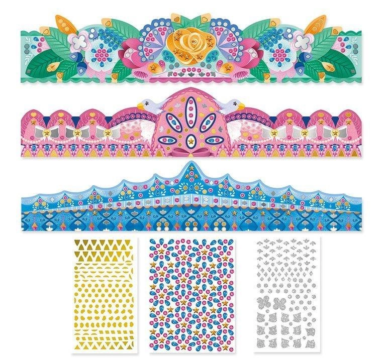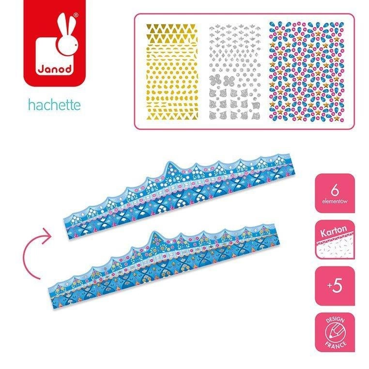 Zestaw kreatywny Kryształki i naklejki Korony francuskiej marki JANOD zawiera 3 kartonowe opaski-korony do ozdabiania – w wyznaczonych miejscach – kolorowymi kryształkami i naklejkami o niebanalnych kształtach. W komplecie znajdują się 3 arkusze drobnych aplikacji. Naklejanie to dla dziecka długie godziny angażującej i jednocześnie uspokajającej, wyciszającej zabawy, a gotowe korony staną się wspaniałym elementem zabawnego przebrania lub dekoracją dziecięcego pokoju.