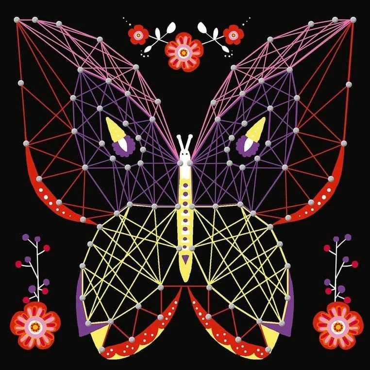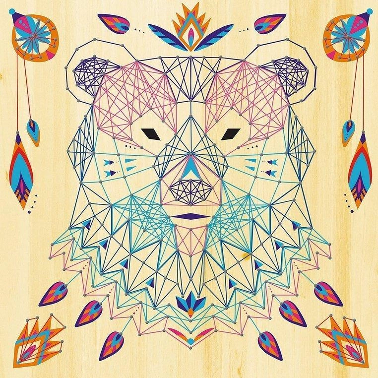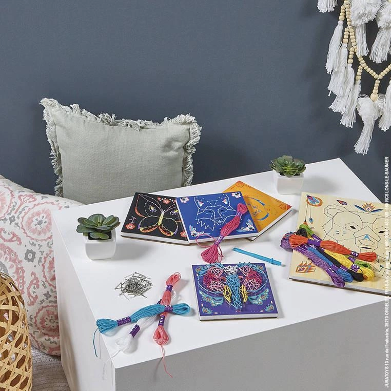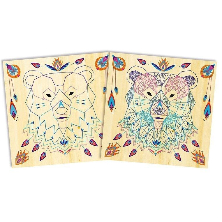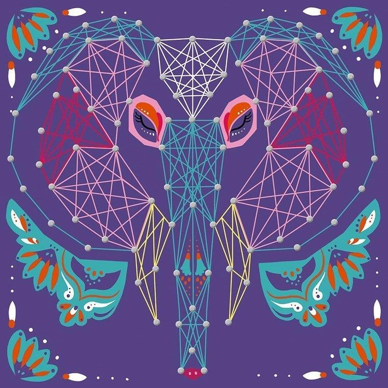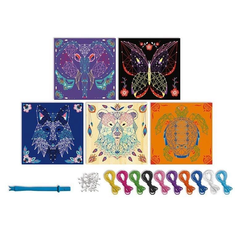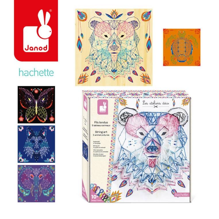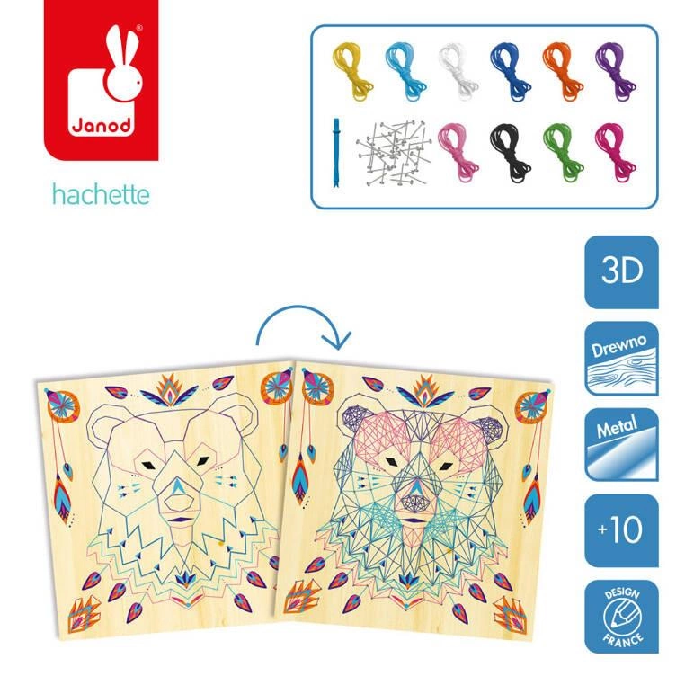 Zestaw kreatywny String Art Zwierzęta francuskiej marki JANOD zawiera 5 plansz z grubej pianki z grafikami zwierząt: duża drafika niedźwiedzia, oraz 4 mniejsze obrazki wilka, słonia, żółwia i motyla, 800 gwoździków, które należy wbić/wcisnąć w zaznaczone na planszach punkty, 10 kolorowych motków muliny oraz narzędzie, ułatwiające wbijanie gwoździków i przeplatanie muliny wokół nich, zgodnie z załączoną szczegółową instrukcją. String art to bardzo ciekawa technika nawlekania kolorowych nici między punktami, tworzących abstrakcyjne geometryczne wzory. Jest to praca przestrzenna, a jej efekty są zachwycające. Powstaną w ten sposób niebanalne sznurkowe obrazy. Przelatanie, czy już samo wbijanie drobnych gwoździków, to dla dziecka długie godziny angażującej i jednocześnie uspokajającej zabawy, a gotowe dzieła staną się powodem do dumy i wspaniałym elementem dekoracyjnym dziecięcego pokoju. Zestaw zaprojektowano we Francji we współpracy z francuską grupą mediową i wydawniczą Hachette. Zapakowany jest w stylowe kartonowe pudełko. Idealnie nadaje się na prezent.