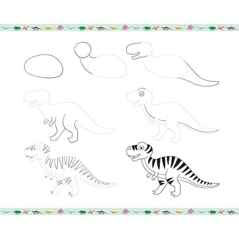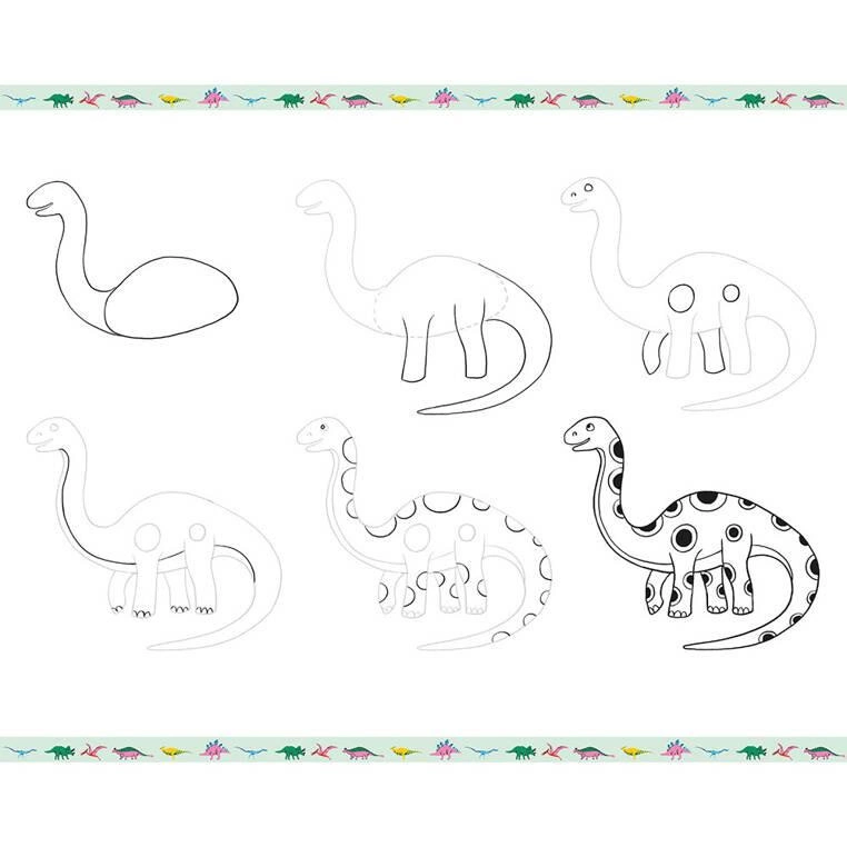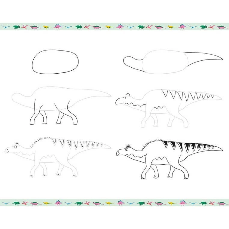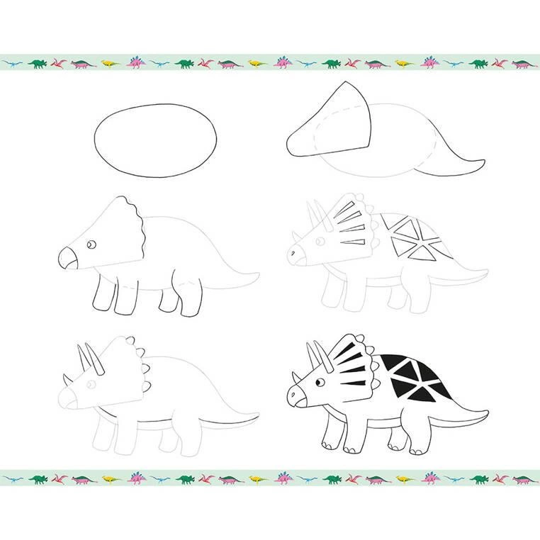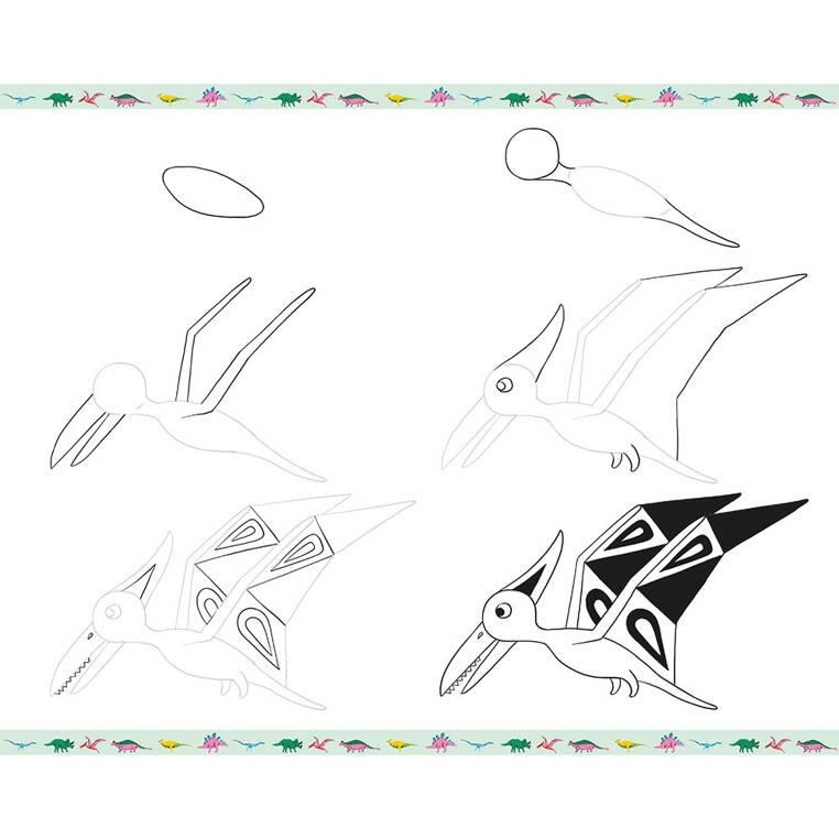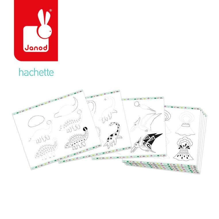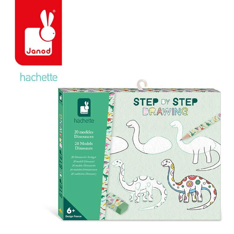 Zestaw kreatywny Rysowanie krok po kroku Dinozaury francuskiej marki JANOD zawiera 20 plansz ze wzorami do odwzorowania krok po kroku, 25 pustych kartek, ołówek HB i gumkę do zmazywania. Rysunki do odtworzenia przedstawiają różne gatunki dinozaurów. Nauka rysunku krok po kroku to wiele godzin angażującej i jednocześnie uspokajającej, wyciszającej zabawy, a gotowe obrazki staną się wspaniałą dekoracją dziecięcego pokoju i powodem do dumy dla małych artystów.