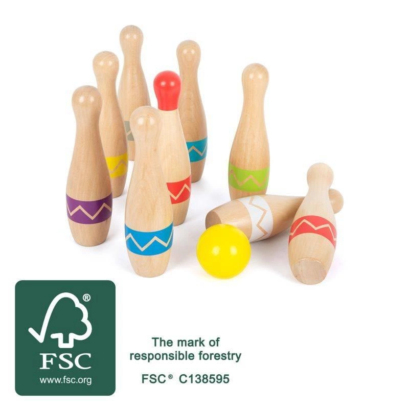 Kręgle dla dzieci od Small Foot z serii Activ wykonane z drewna wysokiej jakości składają się z 9 drewnianych kręgli oraz 2 kolorowych, także drewnianych kul. Ze względu na swoje gabaryty sprawdzą się podczas zabawy w domu, jak i na powietrzu. To rodzaj zręcznościowej gry dla dzieci ćwiczącej celność oraz koordynację ruchowo-wzrokową. Zestaw posiada bawełnianą torbę ułatwiającą przechowywanie kręgli oraz przenoszenie ich w wybrane przez malucha miejsce. Nowoczesne, kolorowe nadruki sprawiają, że pakiet ten jest dobrze widoczny nawet w trawie i z dużych odległości.