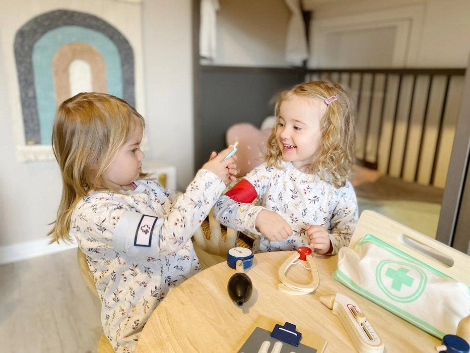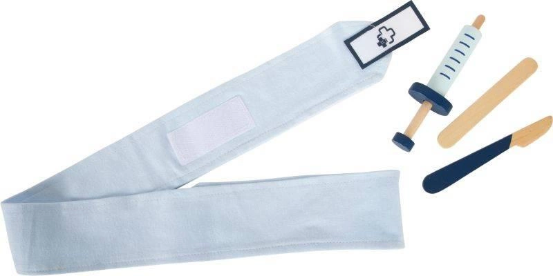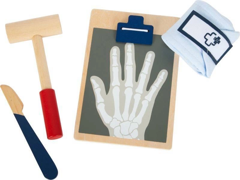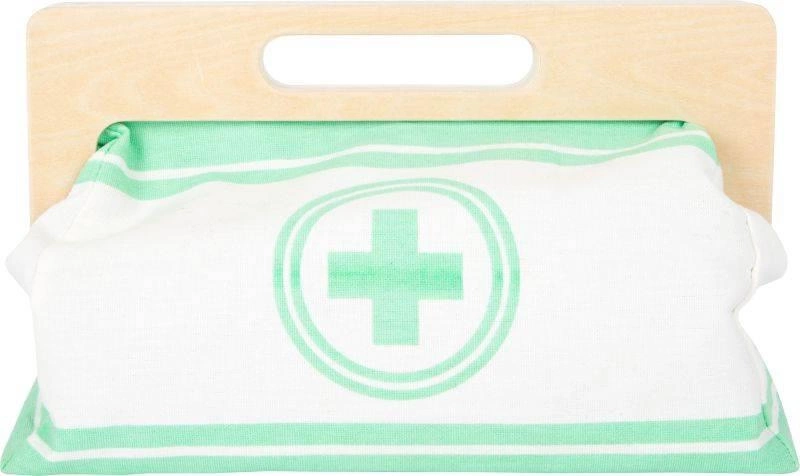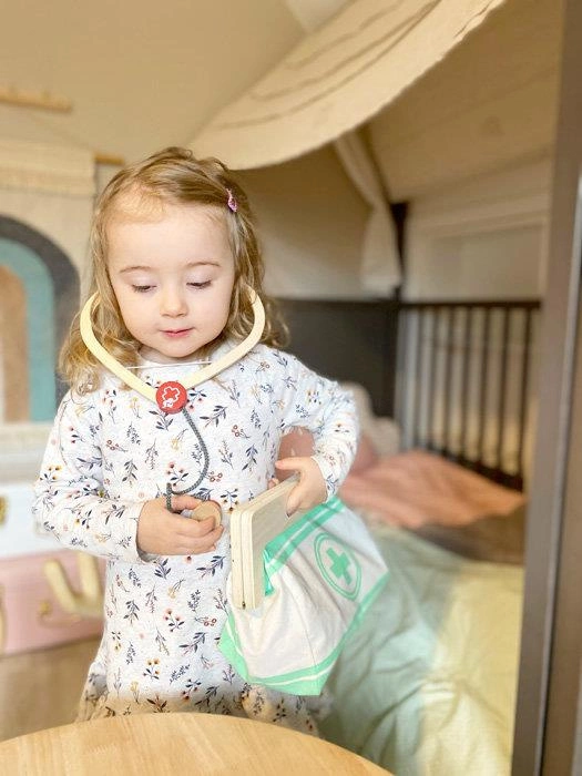 z naturalnego drewna i zamykanym na magnes. W skład torby wchodzą medyczne przyrządy, takie jak: stetoskop, termometr, zabawkowa strzykawka i wiele więcej - wszystko wykonane z wytrzymałego drewna. Ciekawym elementem wyposażenia torby jest ciśnieniomierz z pompką oraz otoskop z prawdziwym szkłem powiększającym. Mały lekarz znajdzie w tej torbie wszystko, czego potrzebuje do pracy. Drewniane naczynia z lekami posiadają ilustracje podpowiadające do czego możemy użyć danego przedmiotu. Cudowny komplet dla małych lekarzy lubiących aktywność i ruch.
