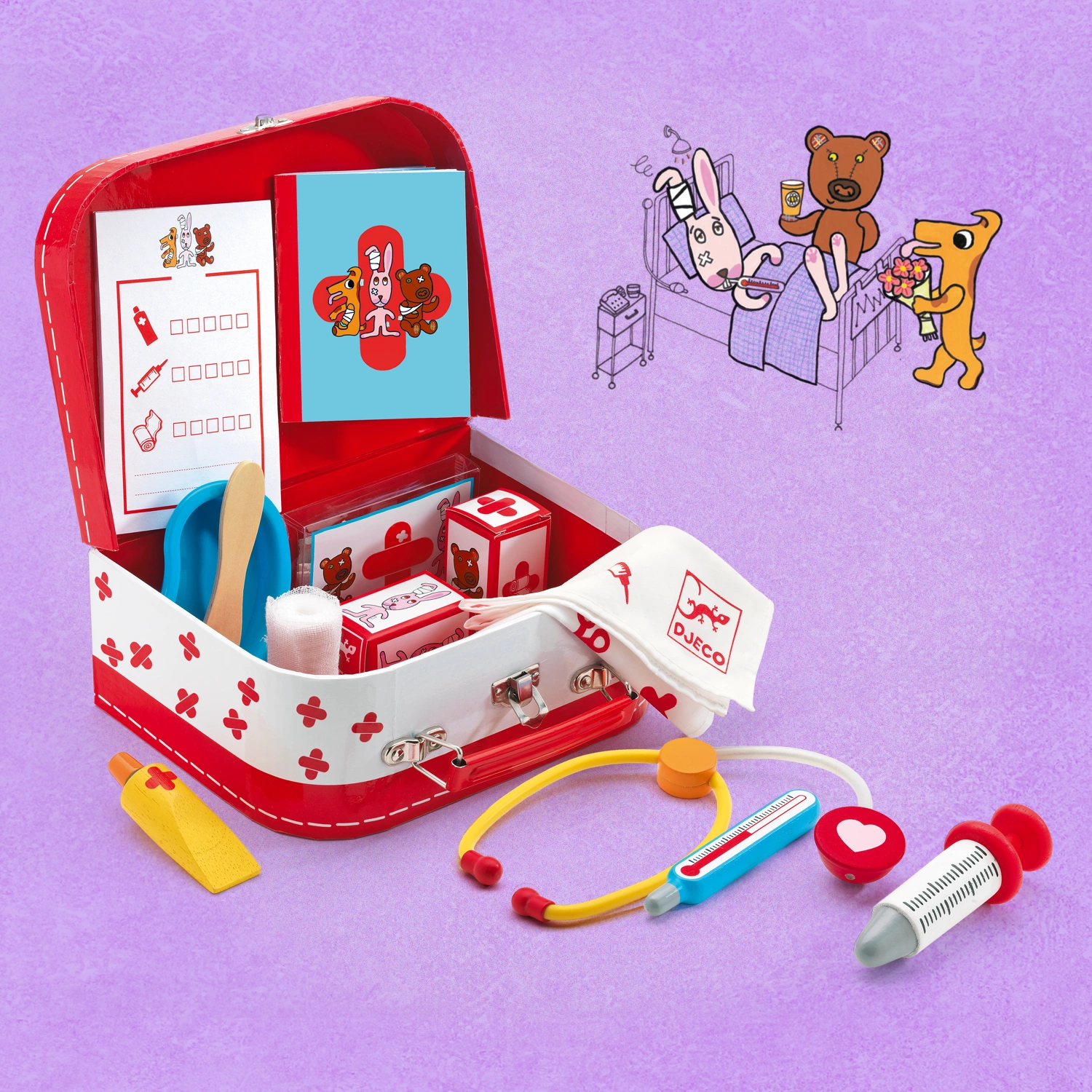 Z tym zestawem młody weterynarz wyleczy wszystkie chore misie i zranione pieski. W walizeczce znajdują się wszystkie potrzebne akcesoria: termometr, strzykawka, bandaże, plastry wielkokrotnego uzytku, maść, 2 opakowania leków, stetoskop, łopatka, rynienka, recepty.