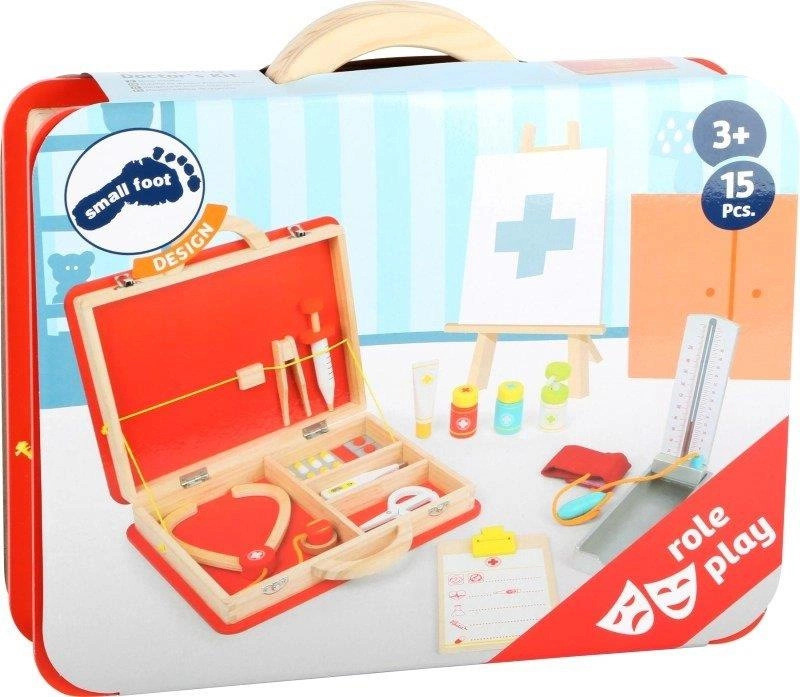 Kuferek Lekarza Small Foot, pełny po brzegi zabawkowych akcesoriów medycznych, wykonanych z drewna. Wyśmienita frajda zapewniona! Zabawka przeznaczona dla dzieci od 3 roku życia.