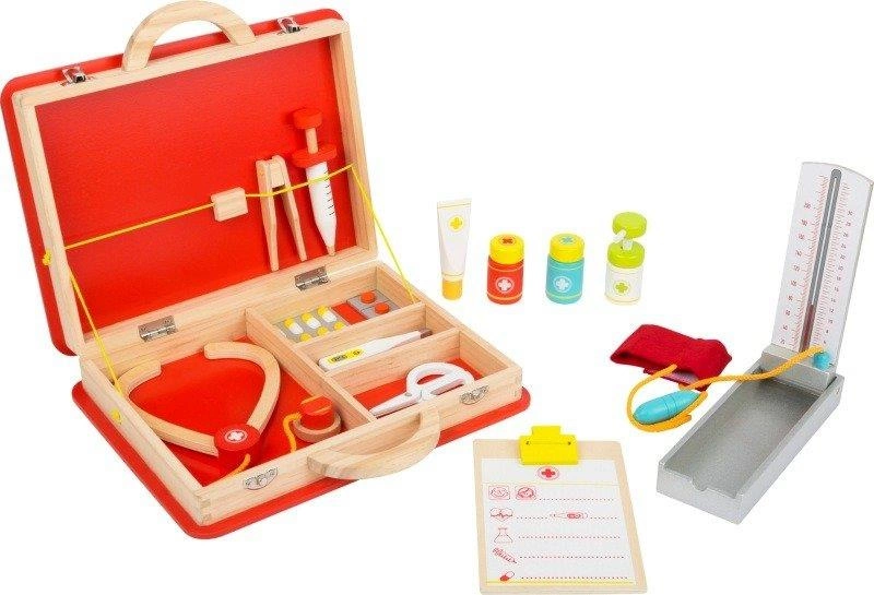 Drewniany zestaw lekarski zapakowany w estetyczną czerwoną walizkę, dzięki której wszystkie przybory znajdują się w jednym miejscu, a całość można łatwo przenosić. Po osłuchaniu stetoskopem, zmierzymy temperaturę a nawet zrobimy zastrzyk. Sprawdzimy ciśnienie pacjenta oraz podamy niezbędne leki, by chorzy jak najszybciej wrócili do zdrowia. Strzykawka oraz pojemnik na maść zaopatrzone zostały w pompę. Wszystkie zalecenia zapiszemy w karcie pacjenta.