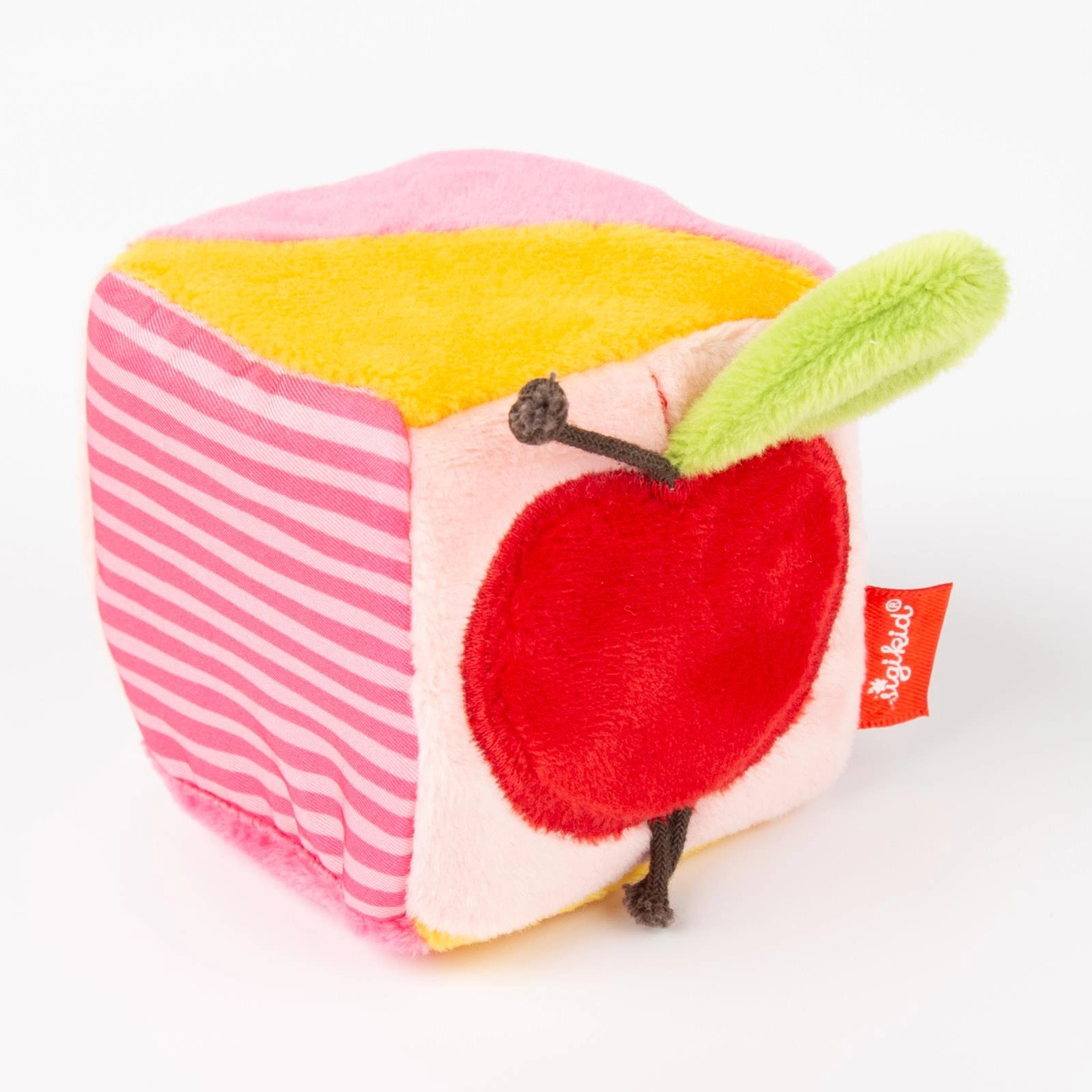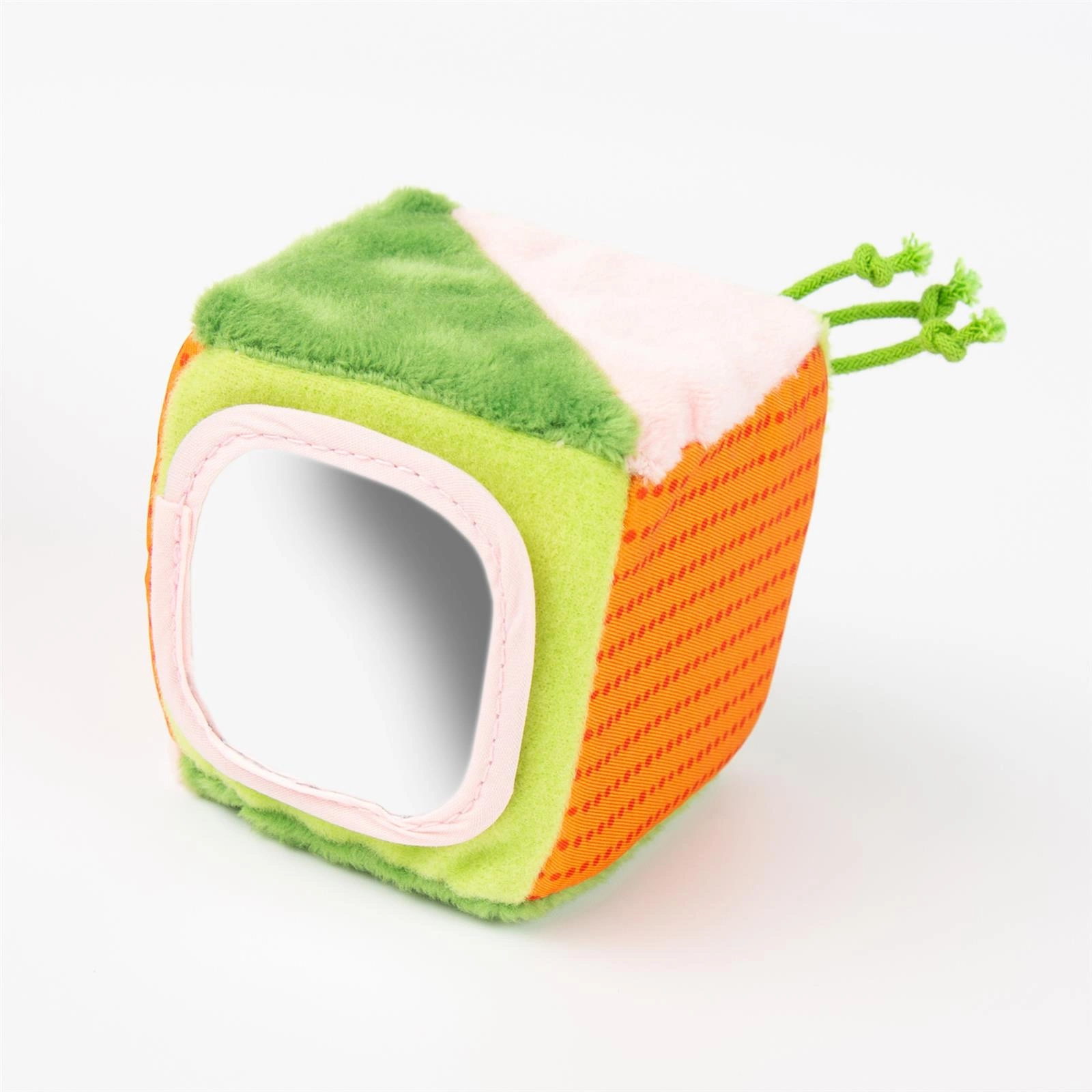Ten wyjątkowy zestaw czterech miękkich kostek przenosi zabawę na nowy wyższy poziom. Każda z kostek kryje akustyczną niespodziankę: piszczałka, grzechotka i szeleszcząca folia ćwiczą słuch dziecka i nagradzają pierwsze próby chwytania. Bezpieczne lusterko przymocowane na rzepy zapewnia mnóstwo zabawy.