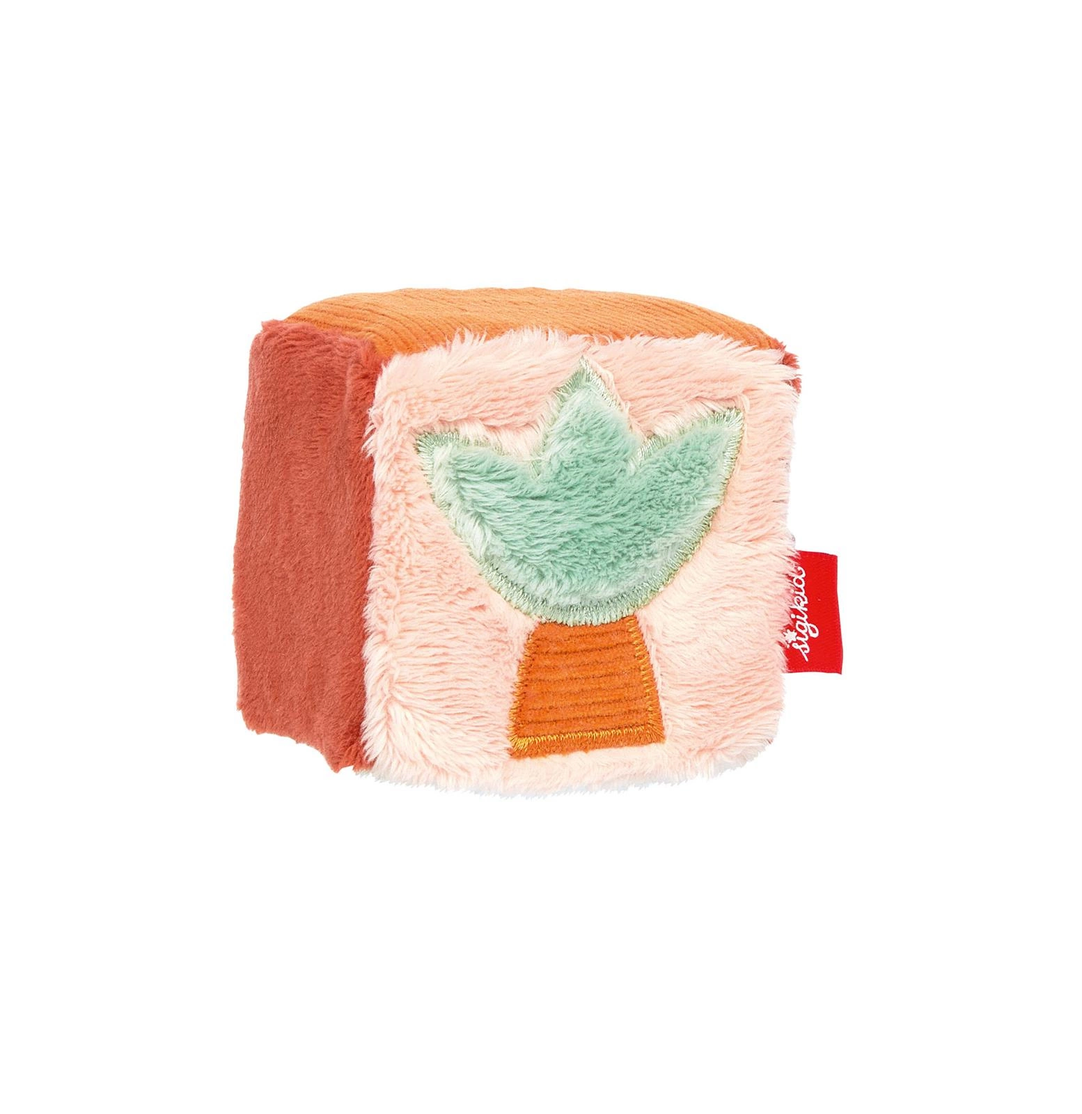 Każda z kostek kryje akustyczną niespodziankę: piszczałka, grzechotka i szeleszcząca folia ćwiczą słuch dziecka i nagradzają pierwsze próby chwytania. Bezpieczne lusterko przymocowane na rzepy zapewnia mnóstwo zabawy.